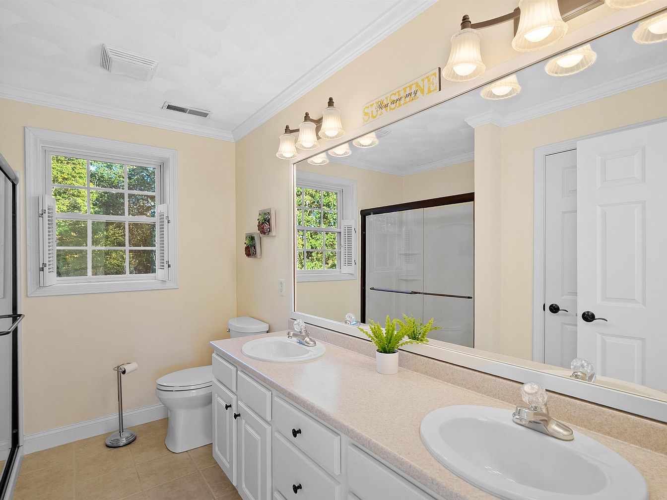 This bathroom features a bright and airy design with a soft yellow color scheme on the walls, complemented by white cabinetry. Two circular sinks are situated on a light-colored countertop, reflecting natural light from the nearby windows. A large mirror spans the length of the vanity, enhancing the sense of space. The room includes a modern glass shower enclosure, while a toilet is discreetly positioned beside it. Stylish light fixtures provide warm illumination, and a small potted plant adds a touch of greenery. The flooring is tiled, contributing to the clean, uncluttered aesthetic of the space.