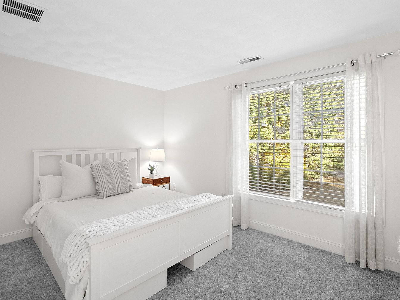 A serene bedroom showcasing a minimalistic design. The walls are painted a soft white, enhancing the natural light that filters through large, multi-paned windows adorned with sheer white curtains. A plush gray carpet adds warmth underfoot. The focal point is a modern white bed with a slatted headboard, dressed in crisp white linens and topped with a textured throw and decorative pillows. A contemporary bedside lamp provides soft illumination on a simple wooden nightstand. The subtle color scheme and clean lines create a tranquil atmosphere, ideal for relaxation and rest.