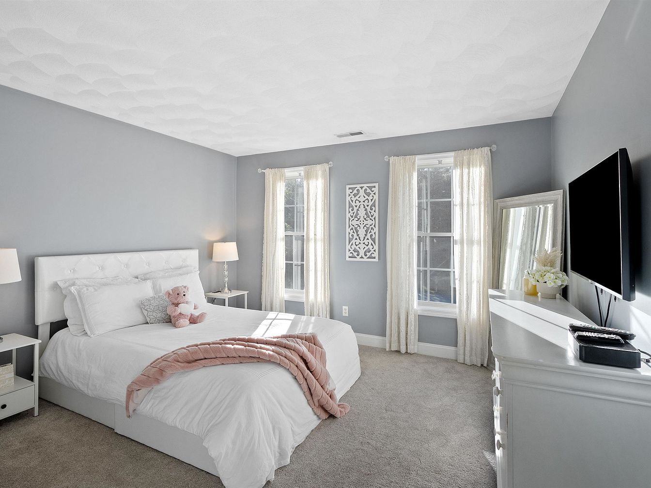 This modern bedroom features soft gray walls that create a calming effect. A plush white bed, adorned with oversized pillows and a light pink throw blanket, dominates the space. Brightened by natural light from large windows dressed in sheer curtains, the room feels airy and welcoming. Flanking the bed are white nightstands with elegant lamps providing cozy lighting. A sleek dresser completes the arrangement, enhancing the clean aesthetic. A decorative wall art piece adds a touch of style, while a mirror reflects light and space. The carpet, in a neutral tone, adds warmth underfoot, blending comfort with sophistication.