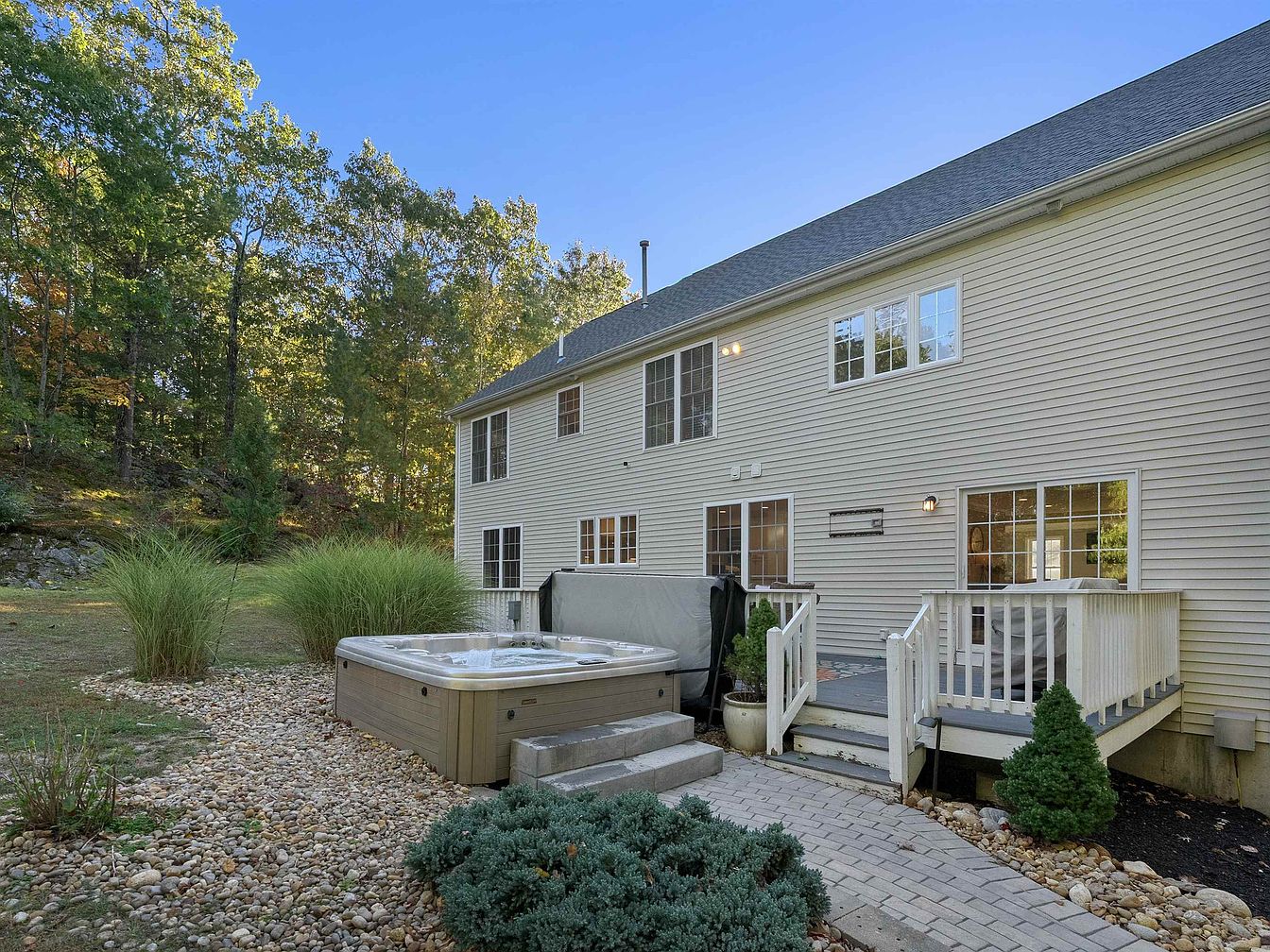 The image captures a serene backyard space featuring a hot tub positioned on a stone patio. Surrounding the tub, lush greenery adds a natural touch, while ornamental grasses provide texture and movement. The home’s exterior showcases a light-colored siding with large windows that invite natural light. A wooden deck provides access to the hot tub, framed by a neat white railing. Pebbled pathways create a rustic aesthetic, leading through well-maintained landscaping to the rear of the house. This outdoor area emphasizes relaxation, blending modern amenities with a tranquil, natural environment.