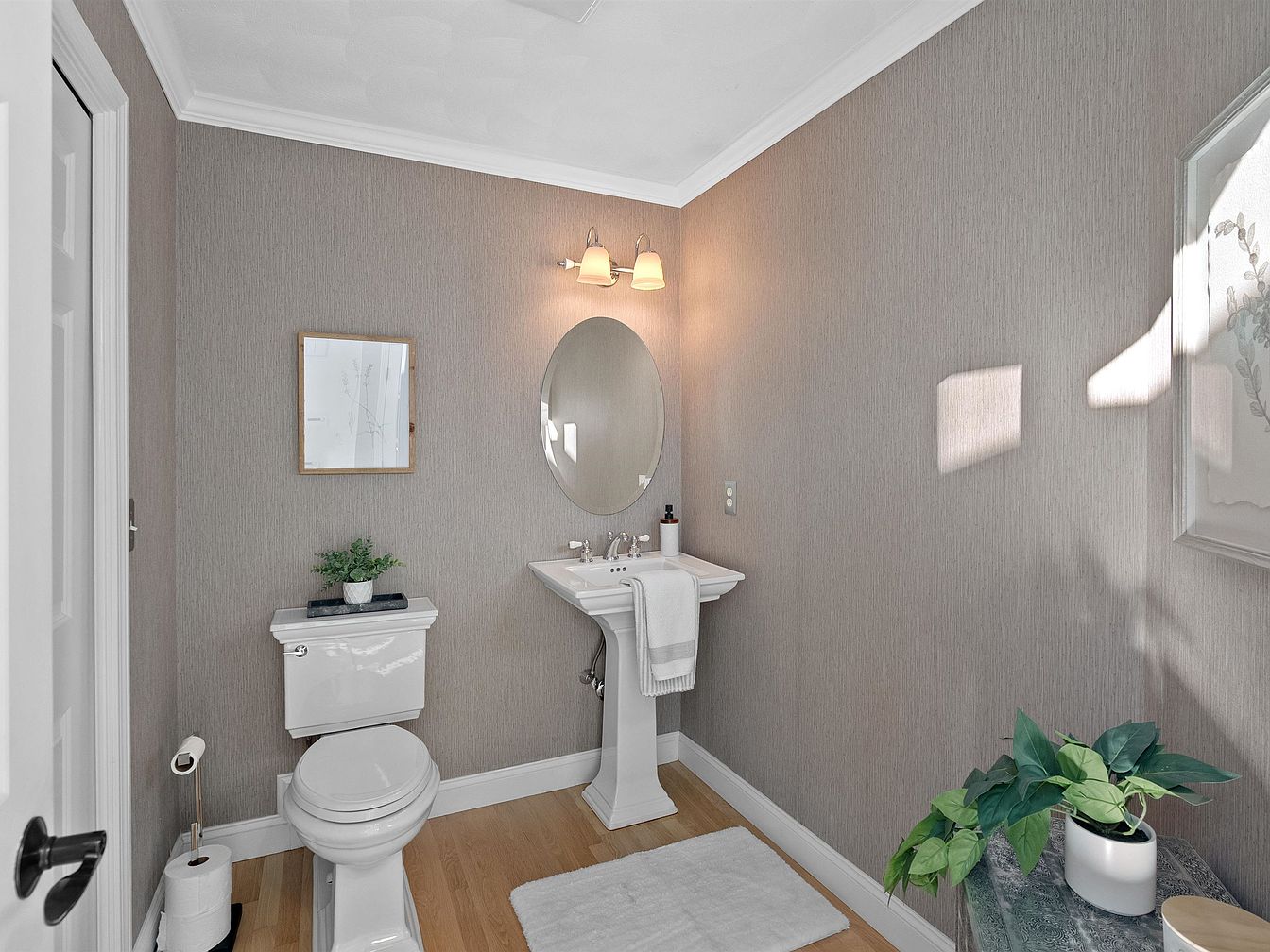 A well-appointed powder room features a beige textured wallpaper that complements the light wooden flooring. A circular mirror hangs above a sleek pedestal sink, reflecting soft light from wall-mounted sconces. The white toilet is neatly positioned beside the sink, while a white plush rug adds warmth. Decor includes a small, elegant potted plant on a dark slate tray and a framed botanical print on the wall, enhancing the airy feel. Simple yet tasteful accessories, like a subtle tissue box and a decorative vase with greenery, create a serene and inviting atmosphere.