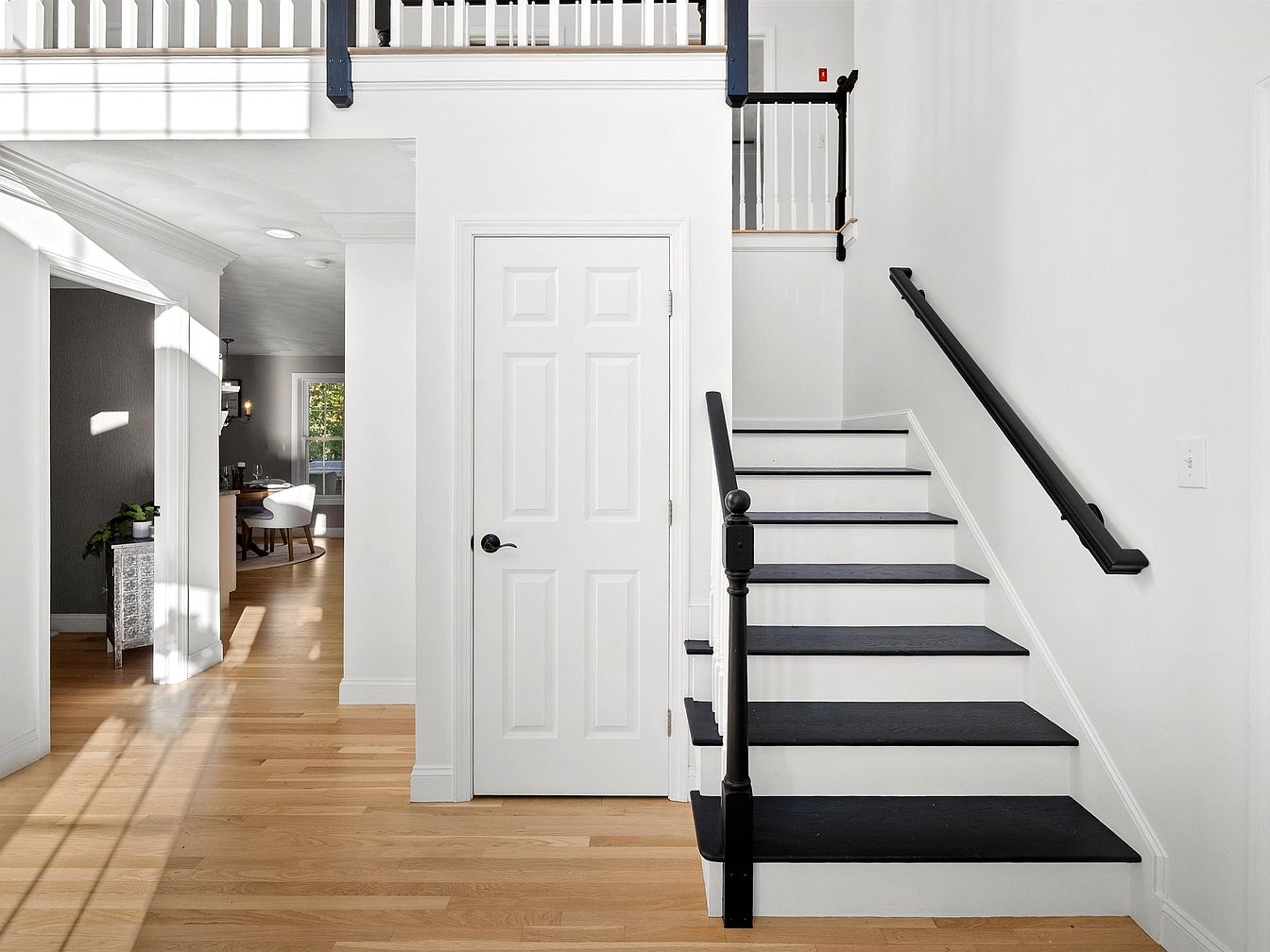 This entryway features a graceful blend of modern and classic design. The walls are painted in a bright white, enhancing the natural light that pours in through strategically placed windows. A staircase with sleek black treads and white risers draws attention upward, accented by a decorative railing. The warm hardwood flooring contrasts beautifully against the crisp walls, providing an inviting feel. To the left, an elegant door leads to an adjacent space, and subtle architectural details, like the crown molding and rounded corners, add character, while strategically placed plants and decor introduce a touch of warmth and vibrancy.