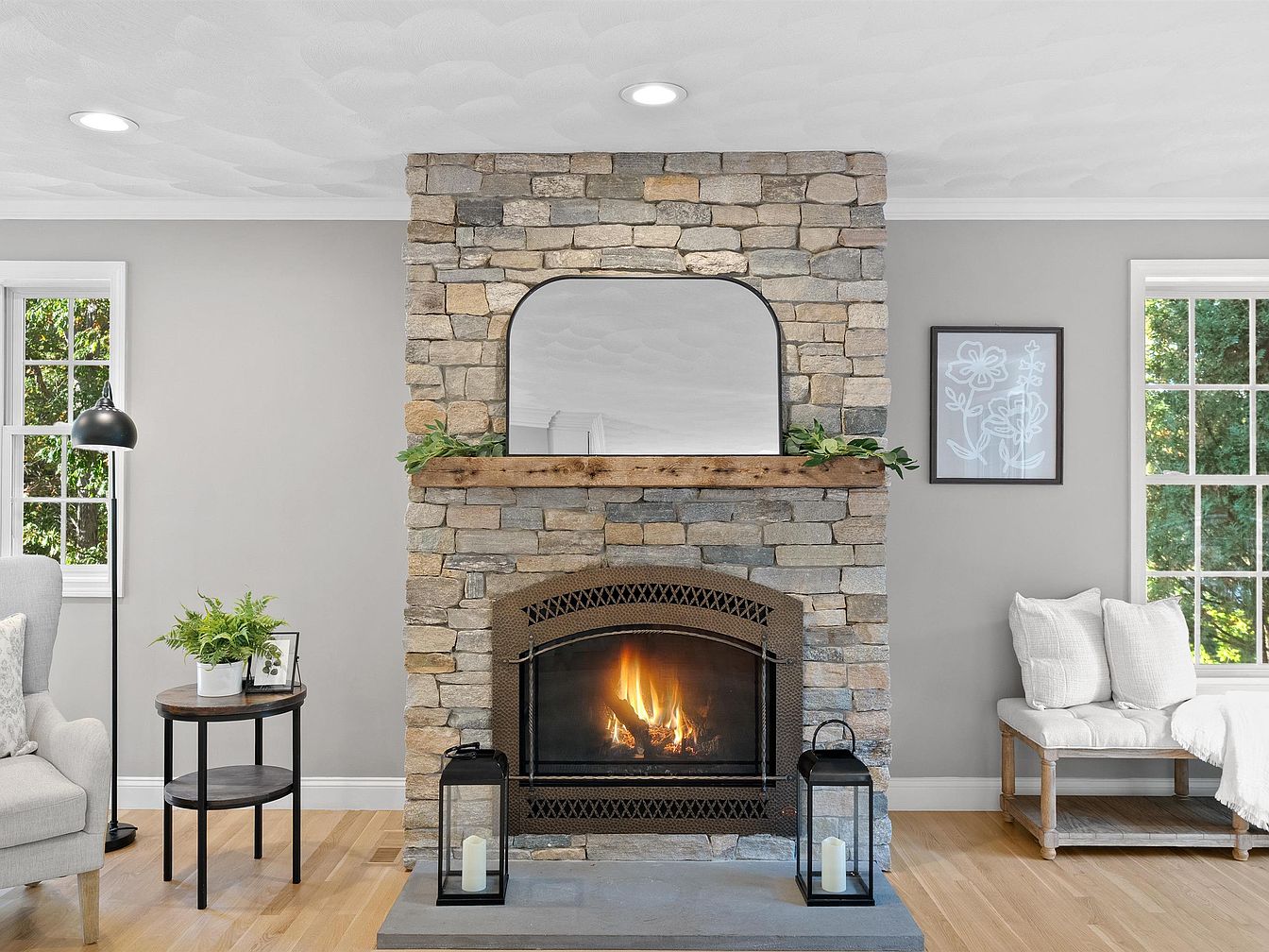The living room showcases a cozy and inviting atmosphere centered around a stone fireplace. This feature wall, crafted from various shades of stone, adds rustic charm. Above the hearth, a wooden mantle, adorned with greenery and a mirror, enhances natural light. A soft gray color scheme unifies the room, complemented by a plush, light gray armchair positioned thoughtfully next to a small round side table. A black floor lamp offers additional lighting. Large windows frame the space, bringing in fresh air and greenery, while a woven bench with white cushions sits elegantly, enhancing the room’s comfort and aesthetics.