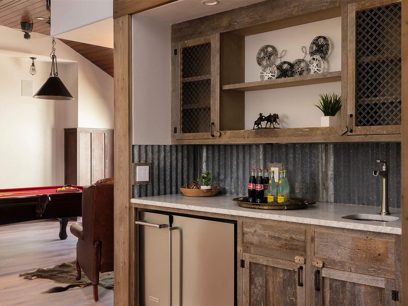 A cozy game room bar area features rustic wooden cabinetry with a weathered, farmhouse look, showcasing a blend of open shelves and mesh-front cabinets. The white stone countertop includes a small sink and is accessorized with a metal tray holding glass-bottled sodas, perfect for family gatherings. A corrugated metal backsplash adds an industrial touch, while decorative accents like film reels, a horse sculpture, and a potted plant bring personality to the space. The room opens into a recreational area with a rich wood billiard table and comfortable leather seating, making it ideal for entertaining both adults and children in a relaxed, stylish environment.