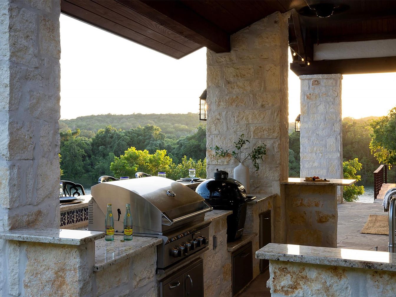 A spacious outdoor kitchen with stone pillars and countertops offers a welcoming, family-friendly atmosphere. The space features a built-in stainless steel grill and a ceramic smoker, ideal for outdoor cooking and gatherings. Light beige stonework paired with neutral granite surfaces provides a warm, rustic elegance. A couple of glass soda bottles and a vase with greenery add a touch of casual charm. The area opens up to lush greenery and overlooks a scenic, tree-covered hillside, allowing for family meals with beautiful sunset views. Ample counter space and bar seating make this an ideal spot for entertaining or relaxing with loved ones.