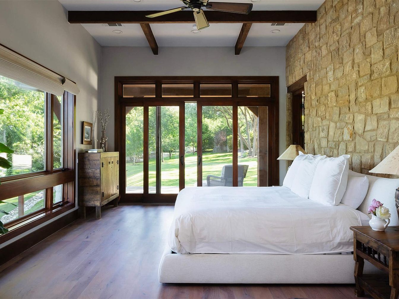Spacious bedroom with large windows letting in natural light, creating a bright and inviting atmosphere. The walls are painted a soft neutral color with one feature wall made of rustic stone, adding texture and warmth to the room. A sleek wooden floor runs throughout, complemented by earth-toned furniture including a solid wooden dresser and matching side tables. The bed is positioned to face a set of expansive glass doors that provide direct access to a lush green backyard—perfect for families with children to enjoy outdoor play. Open space, cozy bedding, and simple decor make this bedroom both comfortable and functional.