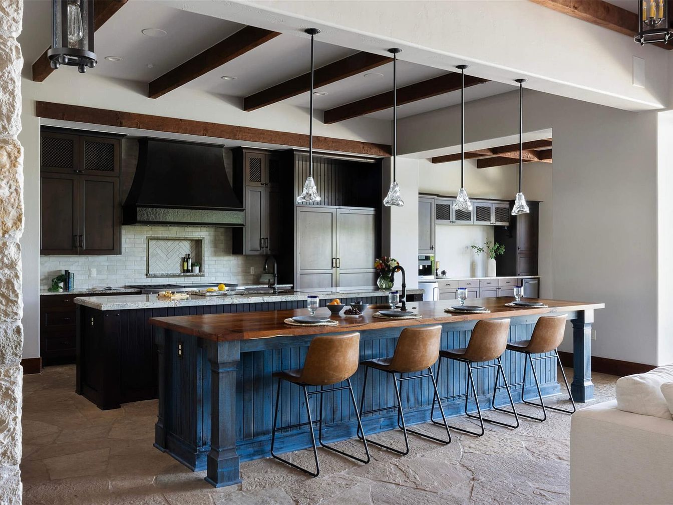 A spacious kitchen features a large central island with a rich blue wooden base and a polished wooden countertop, surrounded by four brown leather and metal barstools for casual family gatherings. Overhead, four pendant lights with glass shades hang from a ceiling adorned with exposed wooden beams, adding rustic warmth. The kitchen cabinetry is dark wood, complemented by a textured light tile backsplash and a prominent black range hood. The open floor plan includes natural stone flooring and neutral wall colors, creating an inviting space that encourages family interaction and effortless entertaining while remaining stylish and functional for everyday living.