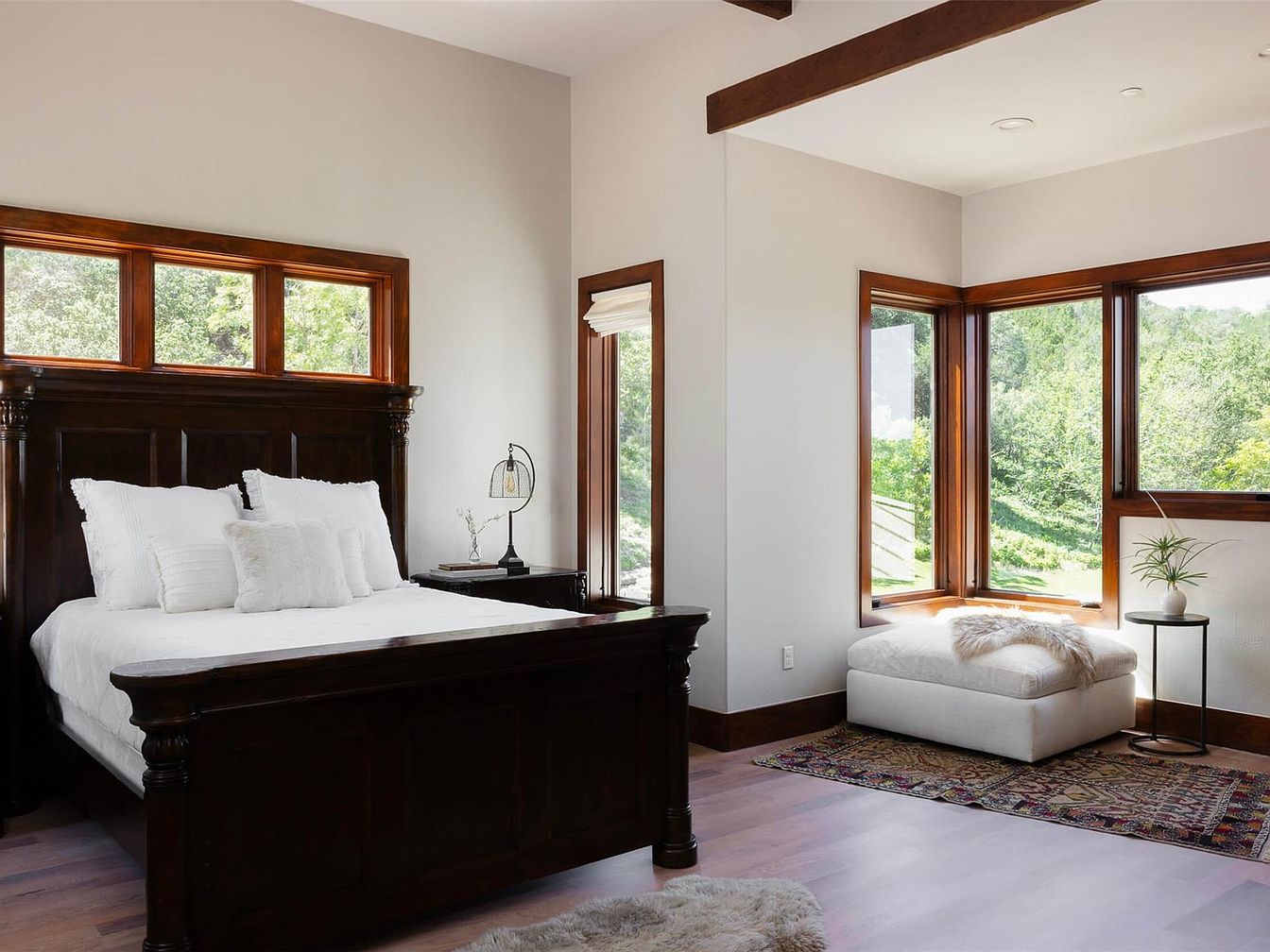 Spacious bedroom filled with natural light, featuring a large, dark wooden bed with crisp white bedding and plush accent pillows, perfect for family comfort. The room’s serene color scheme of soft beige walls and light hardwood flooring provides a calming atmosphere, while rich wood trim along the windows and bed frame adds warmth and sophistication. A cozy corner nook with a soft upholstered bench, decorative rug, and side table with a potted plant creates a relaxing spot ideal for reading or quiet moments. The expansive windows provide lush outdoor views, making this space inviting for both adults and children alike.
