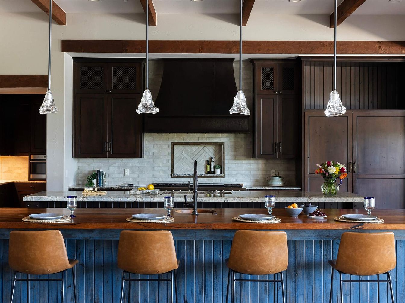 A spacious kitchen island stands at the center of a warm and inviting open kitchen, featuring a wood countertop with rustic blue paneling beneath for a pop of color. Four tan leather stools offer comfortable seating for family meals or casual gatherings. Above, four pendant lights with artistic glass shades hang from a ceiling with exposed wooden beams, adding both elegance and charm. The background showcases dark wooden cabinetry, a tile backsplash in soft neutral tones, and an integrated stainless-steel range. A vase of fresh flowers and neatly set plates add a lively, welcoming atmosphere ideally suited for family living and entertaining.