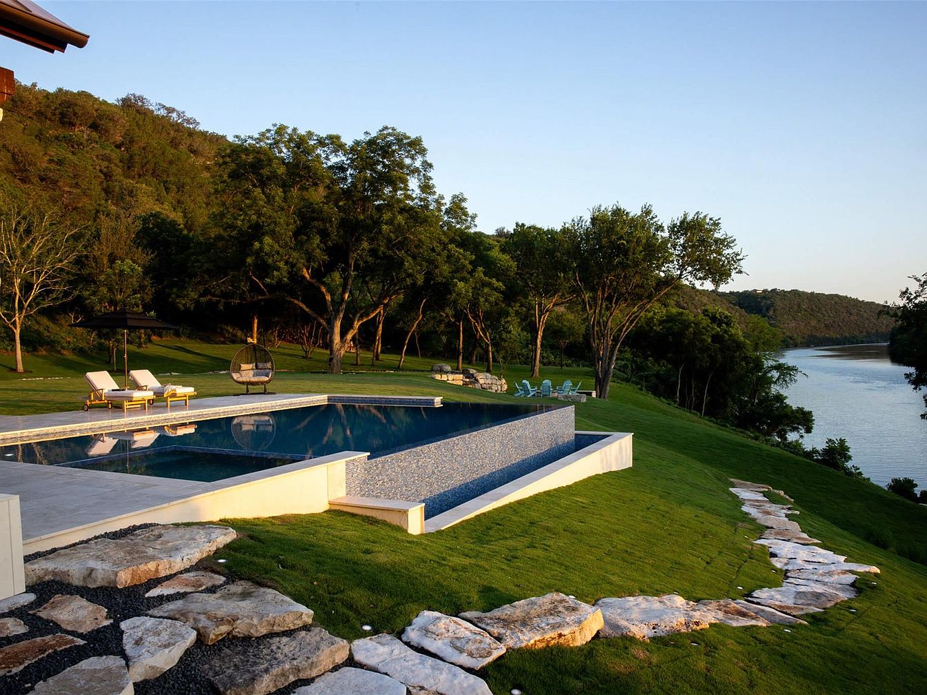 A serene outdoor space featuring an inviting pool with clean, crisp lines and a shimmering water surface. Surrounding the pool, lush green grass and mature trees provide ample shade and natural beauty, making it perfect for family playtime, picnics, or gatherings. Comfortable lounge chairs and a stylish egg-shaped hanging seat invite relaxation for every family member. Beyond the pool, a stone path curves gently down the grassy slope, leading towards a picturesque lake. The tranquil setting, spacious lawn, and clear separation between pool and yard ensure a safe, scenic, and family-friendly environment for all ages to enjoy together.