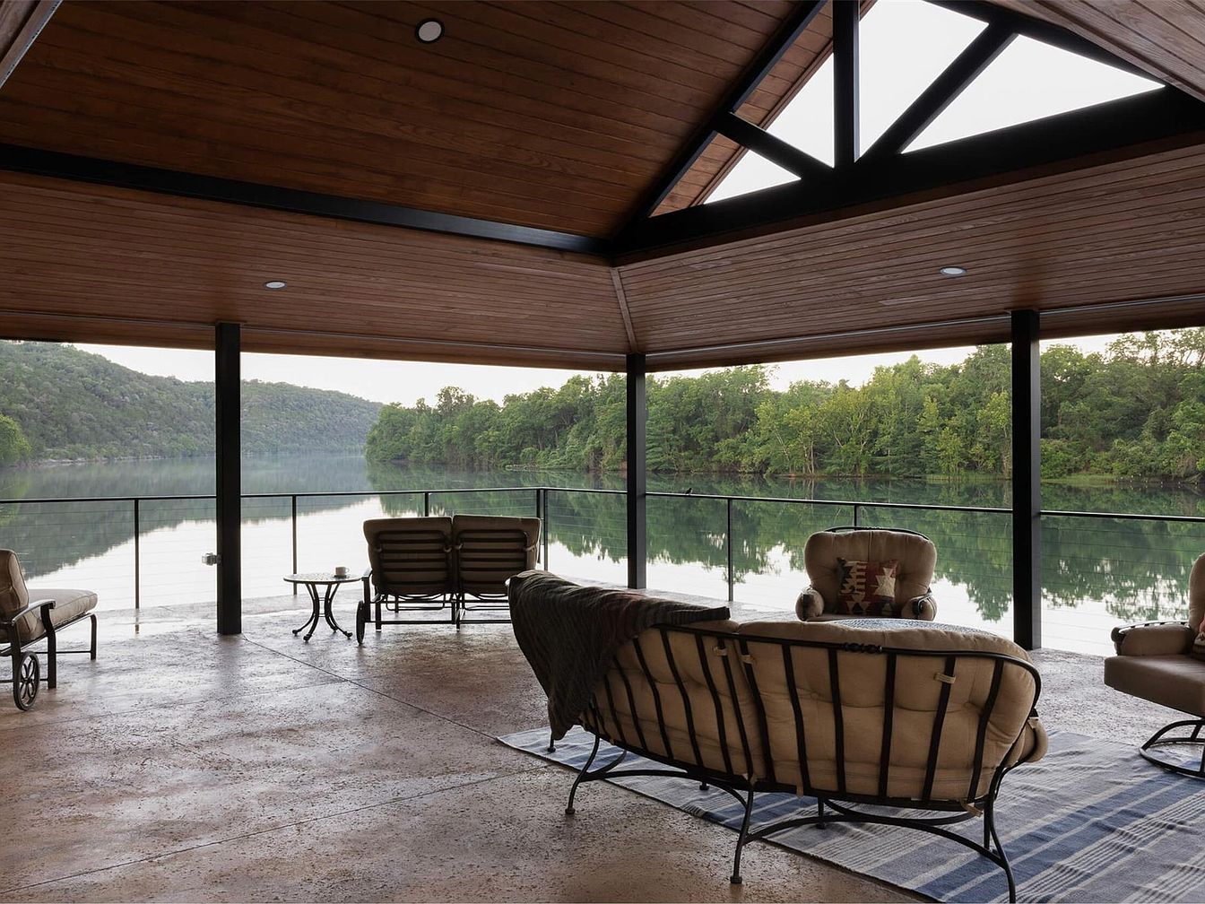 A spacious covered patio overlooks a serene lake surrounded by lush green trees, creating a tranquil, family-friendly retreat. The patio features a vaulted wooden ceiling with exposed black steel beams and recessed lighting, providing a warm and inviting atmosphere. Comfortable cushioned seating, including loveseats and armchairs arranged on a textured rug, encourages gatherings and relaxation. The furniture is upholstered in neutral tones, blending seamlessly with the natural environment and modern architecture. A sturdy glass railing ensures safety while providing unobstructed lake views, making this outdoor space ideal for family conversations, quiet moments, or watching children play in a secure environment.