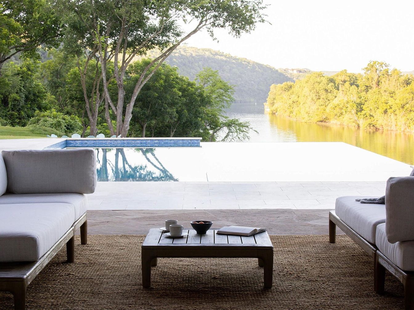 Expansive outdoor seating space overlooks an inviting infinity-edge pool and tranquil lake beyond, framed by lush green trees and rolling hills. Two modern, light-gray cushioned sofas stand on a textured woven rug, with a low wooden coffee table in between holding coffee cups and an open book, creating a cozy gathering spot for family. The neutral color scheme of the furniture complements the natural stone tiles underfoot and the calming blue from the water outside. The layout is open and spacious, perfect for family relaxation, safe play, and socializing while enjoying the peaceful views and fresh air.