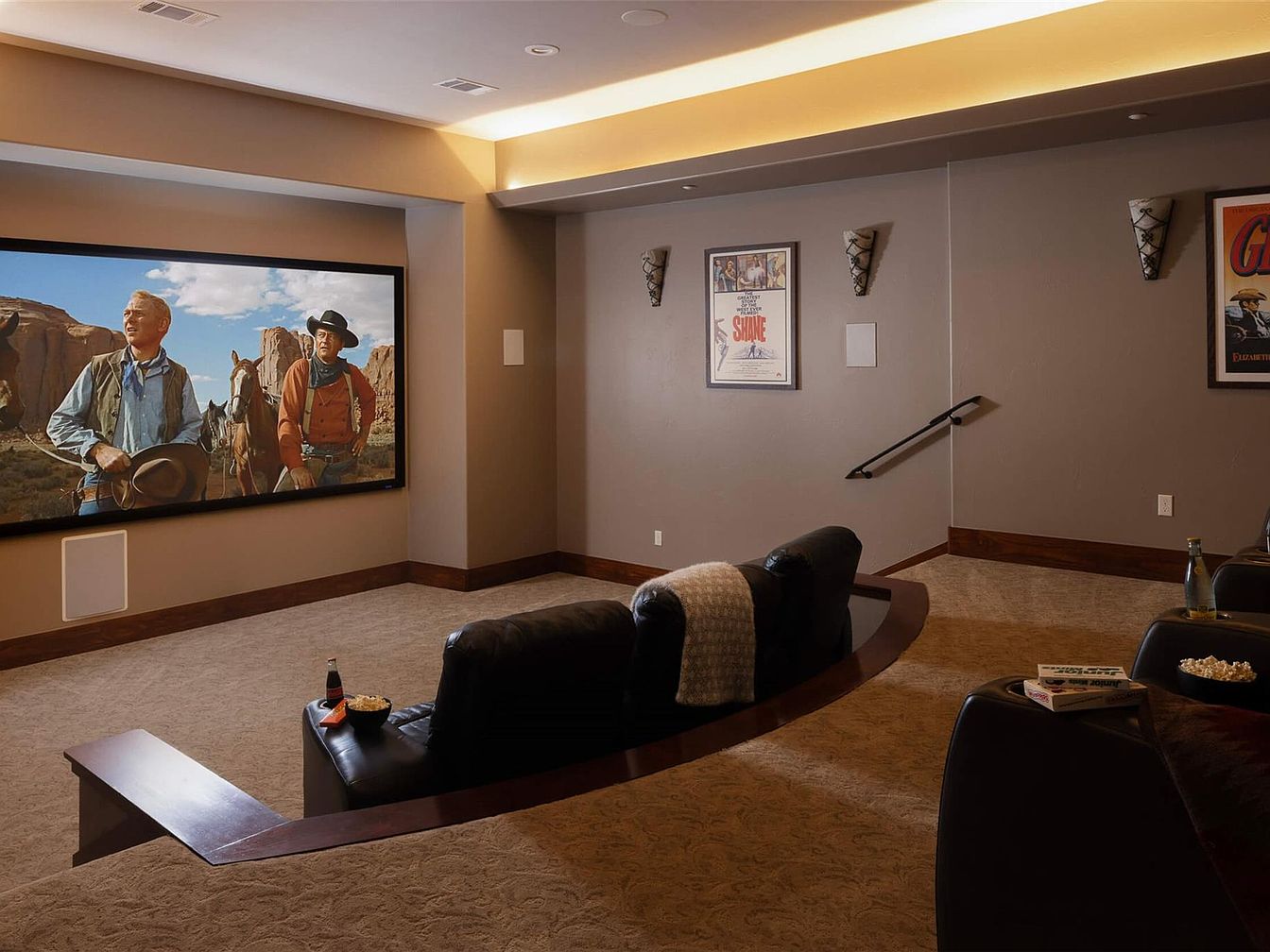 A spacious home theater room features plush black leather recliner seating arranged in a curved layout facing a large wall-mounted movie screen. The taupe walls create a cozy and neutral setting, complemented by soft beige carpeting throughout. Movie posters and decorative sconces add personality and a touch of classic cinema charm to the walls. With built-in steps and subtle recessed lighting, the room is accessible and welcoming for all ages. Convenient side tables hold snacks and drinks, making it an ideal spot for family movie nights. The overall design emphasizes comfort, functionality, and entertainment for a family-friendly home.
