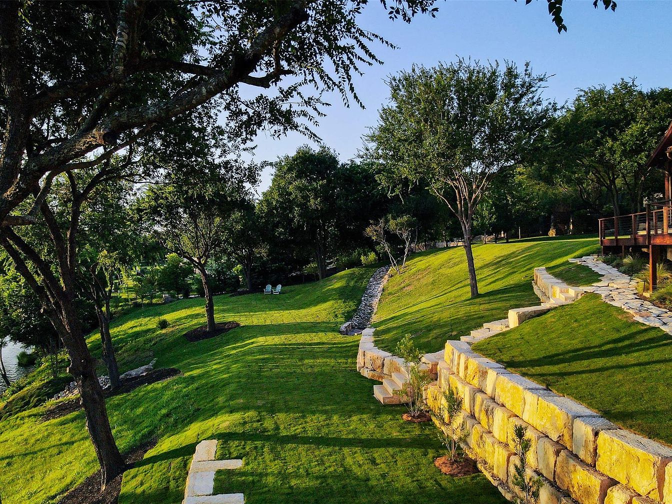 A spacious backyard features a gently sloping lawn with vibrant green grass, ideal for family activities and children to play safely. Mature trees provide ample shade, creating a serene and inviting atmosphere throughout the space. A rustic stone pathway curves gracefully alongside the yard, bordered by a sturdy stone retaining wall that adds both aesthetic charm and practical landscaping. In the distance, two white Adirondack chairs offer a relaxing spot for parents to watch over children or enjoy afternoon gatherings. The design blends natural beauty with functional elements, making it perfect for all ages to enjoy outdoor living together.