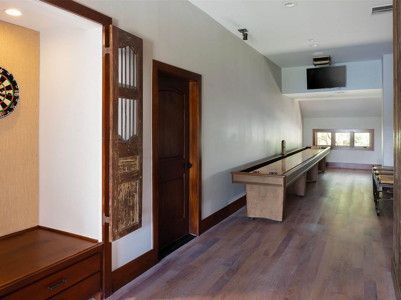 A spacious, family-friendly game room with wood flooring and neutral-colored walls, offering a welcoming atmosphere for gatherings and entertainment. To the left, a cozy built-in bench with a storage drawer is topped by a dartboard, providing space for relaxed seating during play. A rustic wooden swinging door adds a touch of farmhouse charm, matching the dark wood trim and interior door. The focal point is a long shuffleboard table that runs nearly the room’s length, ideal for group games with kids or adults. Large windows at the far end flood the area with natural light, and a wall-mounted TV above enhances recreation options.