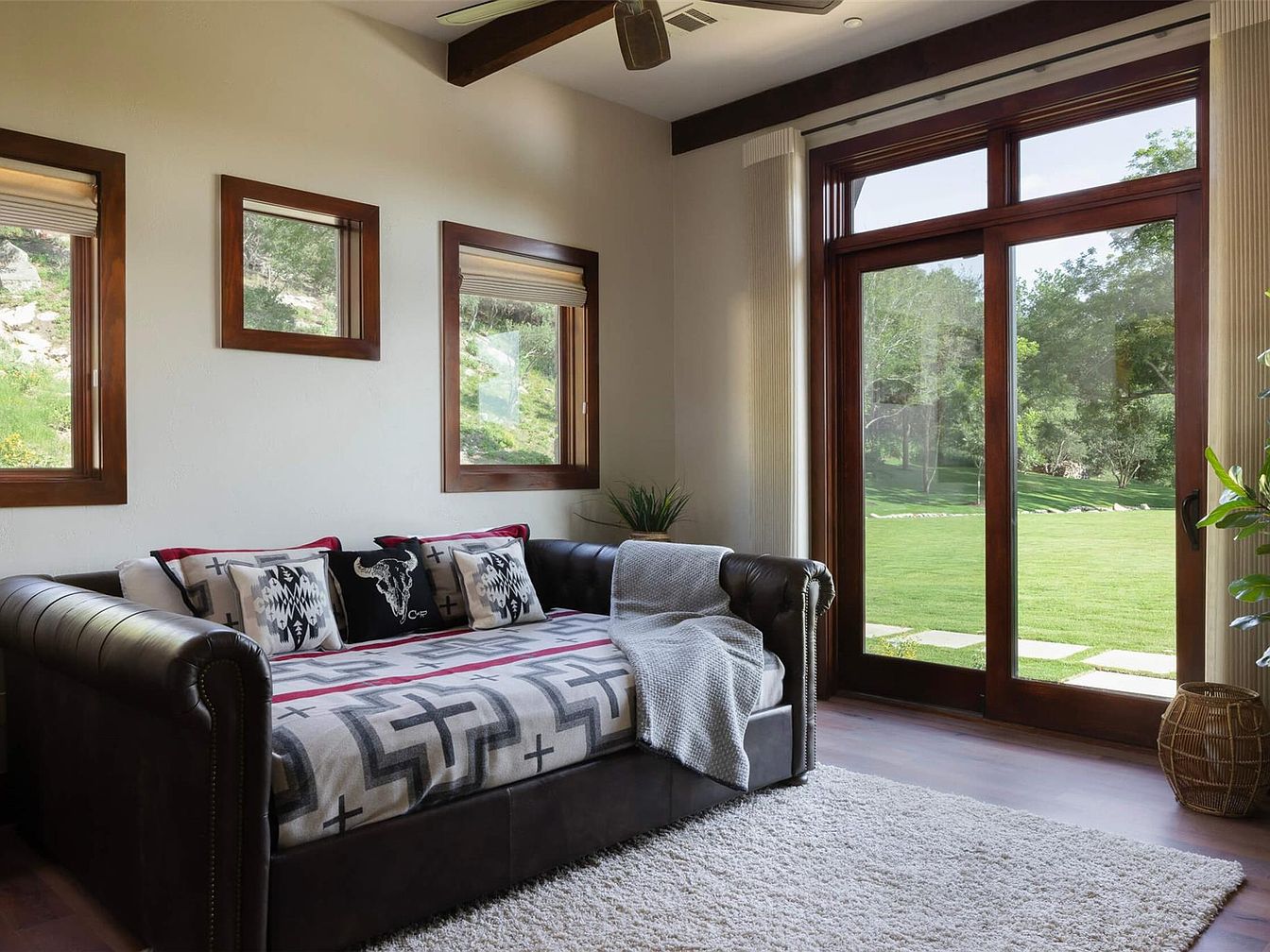 A cozy family room features a comfortable dark leather daybed adorned with Southwestern-patterned blankets and decorative pillows, perfect for lounging or accommodating guests. The space is bathed in natural light from three square windows and expansive sliding glass doors with rich wooden trim, offering a seamless view of the lush, green backyard. The light walls and soft, neutral carpet create a calming atmosphere, while potted plants and layered textiles add warmth and hominess. Spacious and inviting, this room is ideal for relaxing, watching children play outside, or enjoying family gatherings in a bright, airy setting.