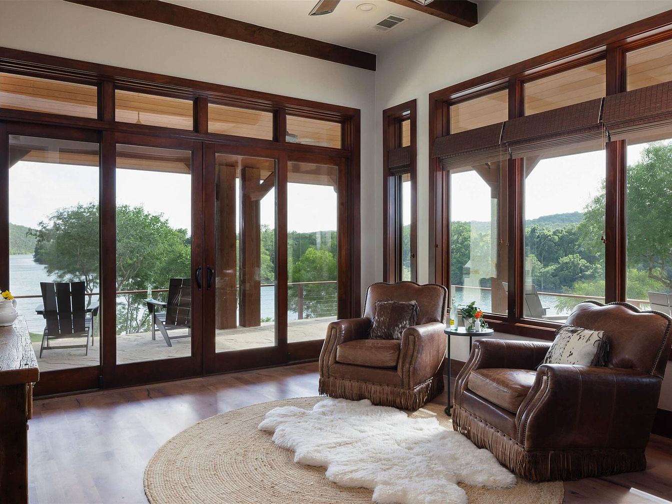A cozy lakeside sitting area featuring two large, leather armchairs with fringe trim, each adorned with plush, textured throw pillows. The seating is arranged on a soft, white sheepskin rug layered over a round woven beige mat, enhancing comfort for families with children. Floor-to-ceiling windows with rich wooden frames bathe the space in natural light while offering panoramic views of the lake and lush greenery outside. The wood-paneled ceiling beams blend harmoniously with the hardwood floors, creating a warm and inviting atmosphere. Neutral, earthy tones and the open, uncluttered layout make this an ideal, family-friendly retreat for relaxation and conversation.