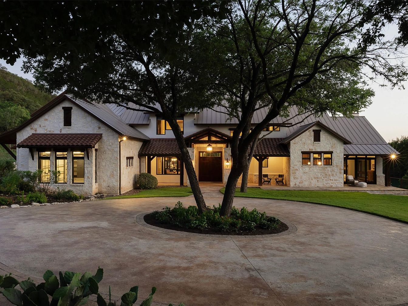 A charming front exterior of an American home with an inviting, spacious driveway curved around a central, landscaped flower bed. The stone-clad facade features warm, natural tones, and a standing seam metal roof that complements the earthy aesthetic. Pleasant outdoor lighting highlights the architectural details, including gabled roofs, covered entryways, and large, welcoming windows. The lush green lawn and mature shade trees provide plenty of space for children to play safely, while the generous front porch offers a cozy spot for family gatherings. Overall, the entryway exudes a sense of warmth and security, perfect for family living.