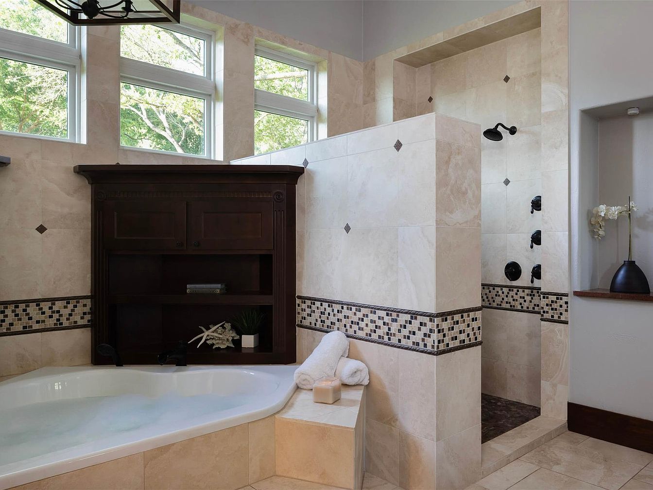 Spacious master bathroom designed with family comfort in mind, featuring a large soaking tub with a bookshelf or built-in cabinetry for storing bath essentials and decor. Adjacent to the tub is a walk-in shower framed by gleaming beige marble tiles with elegant mosaic accent strips. Natural light pours in from three tall windows offering a serene view of greenery and contributing to a bright, inviting ambiance. The color palette combines creamy tones with rich, dark wood, and black fixtures for a sense of warmth and sophistication. Sleek finishes, soft rolled towels, and decorative flowers create a relaxing, spa-like environment perfect for family evenings.