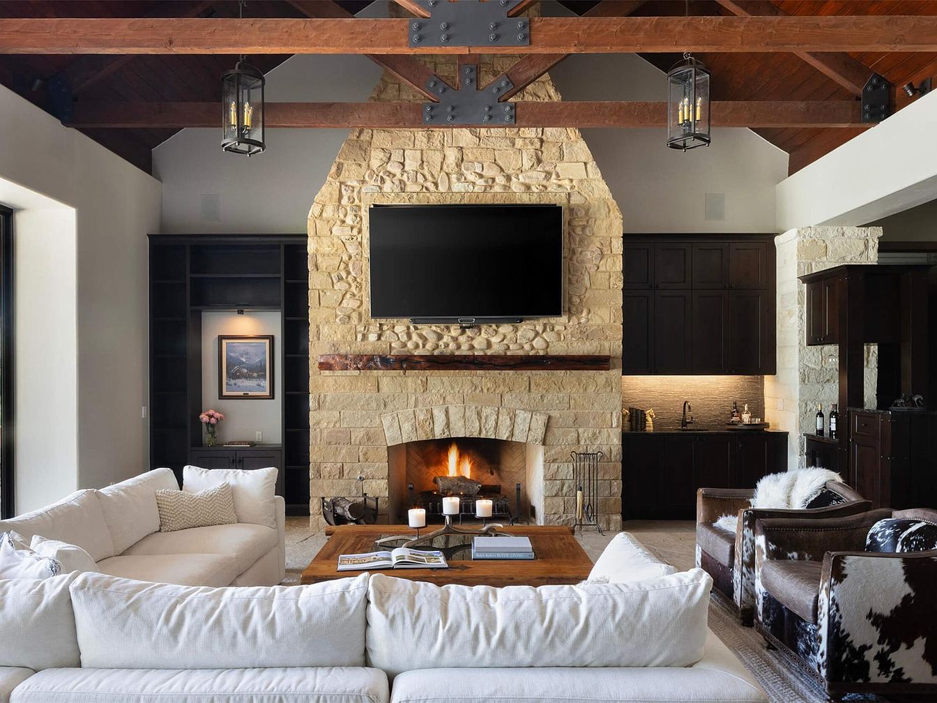 Spacious and inviting living room featuring a vaulted ceiling with exposed dark wooden beams and elegant black iron accents. The focal point is a grand stone fireplace stretching up to the ceiling, topped with a mounted flat-screen TV. Soft, neutral-toned sofas with cozy white upholstery are arranged around a large wooden coffee table, perfect for family gatherings. Rich wood cabinetry and shelving flank the fireplace, providing ample storage and display space, while barn-style chairs with faux fur accents add comfort and rustic charm. Tasteful decorative items and warm lighting create a welcoming, family-friendly atmosphere ideal for relaxation or entertaining.