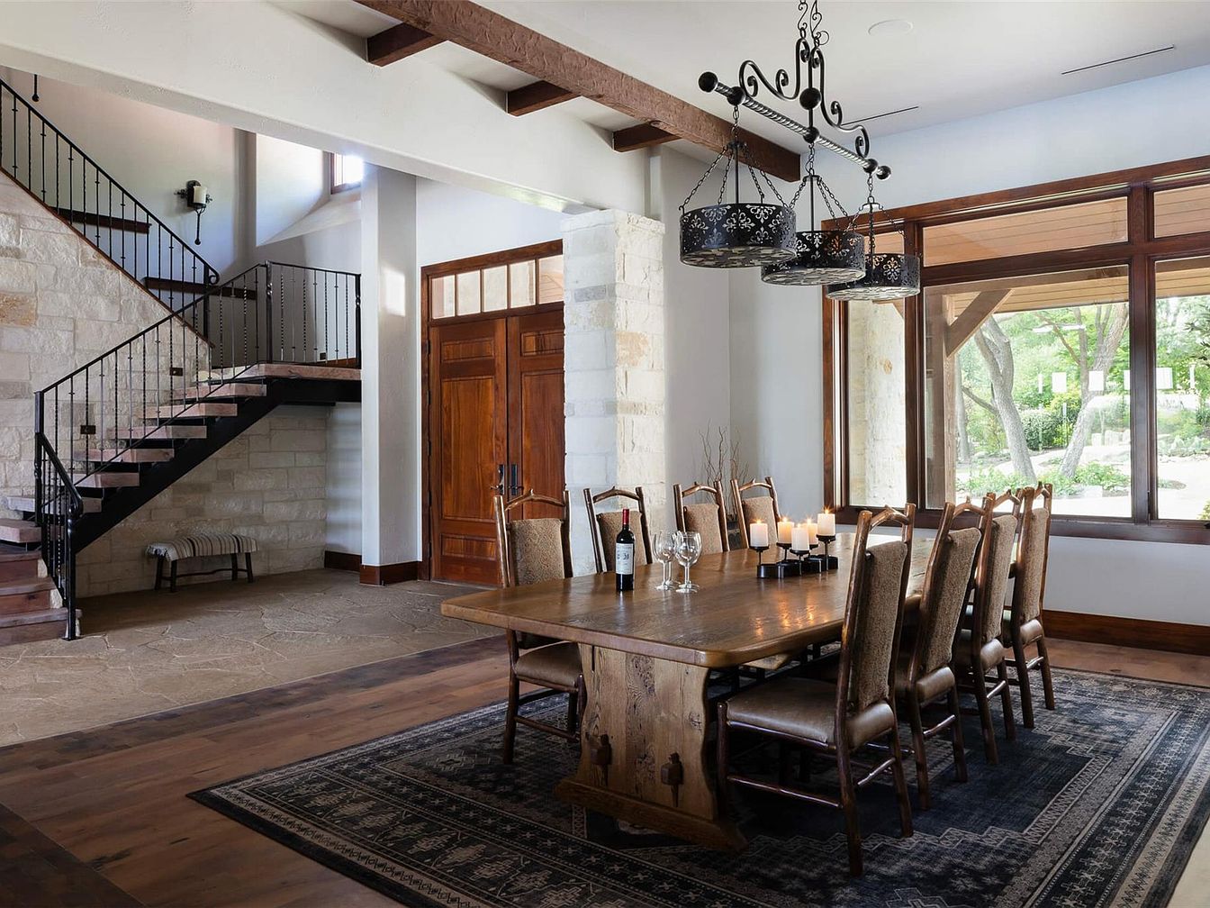 Spacious dining area with a rustic wooden table that seats eight, surrounded by upholstered chairs for comfort, perfect for family meals and gatherings. The space features a large, black wrought-iron chandelier above the table, adding a touch of elegance. Natural light streams through tall windows offering scenic views of the outdoors. The stone accent wall, wooden beams, and a sturdy staircase with iron railings blend warmth and durability. The open layout seamlessly connects the entryway to the dining area, while a cushioned bench adds convenience. Neutral earth tones create a welcoming, family-friendly atmosphere, ideal for creating memories together.