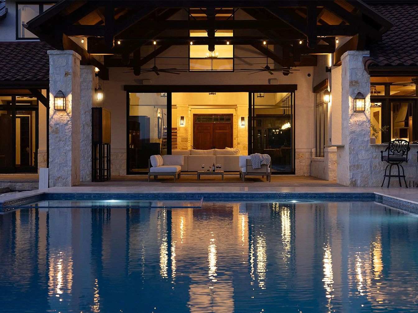 A spacious covered patio overlooks a sparkling blue swimming pool, perfect for family gatherings and outdoor fun. The area features a pair of modern, cushioned lounge chairs and a central table, inviting relaxation and conversation. Warm wall-mounted lanterns and soft string lights create a welcoming ambiance as evening falls. The patio is framed by sturdy stone columns and exposed dark wood beams that provide architectural interest and a cozy, sheltered retreat. Large glass doors seamlessly connect the patio to the main home, ensuring easy flow between indoor and outdoor spaces. Neutral tones and soft textures enhance the family-friendly, inviting atmosphere.
