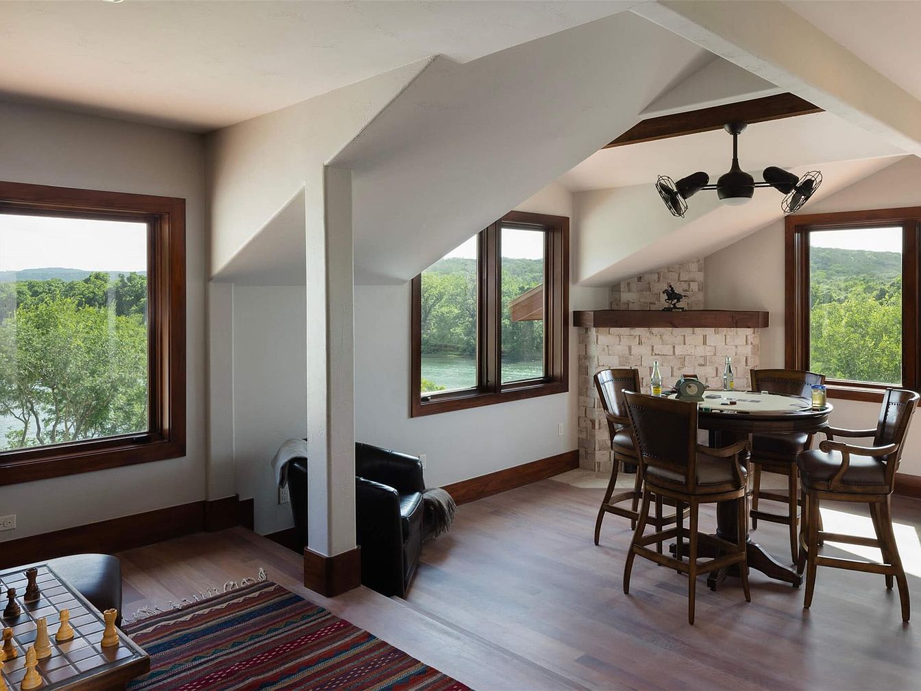 A spacious and bright game room with sloped ceilings and large windows on three sides, providing panoramic views of lush greenery and a river outside. The room includes a round wooden game table surrounded by four comfortable high-back chairs, making it ideal for family game nights or gatherings. The corner features a cozy white brick fireplace with a wooden mantel, adding warmth and character to the space. A colorful striped area rug and a chess table with a set-up board invite relaxation and play. Wood-framed windows and neutral wall tones create a tranquil, family-friendly atmosphere filled with natural light.