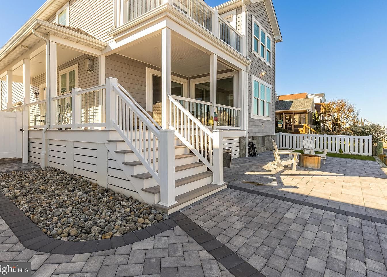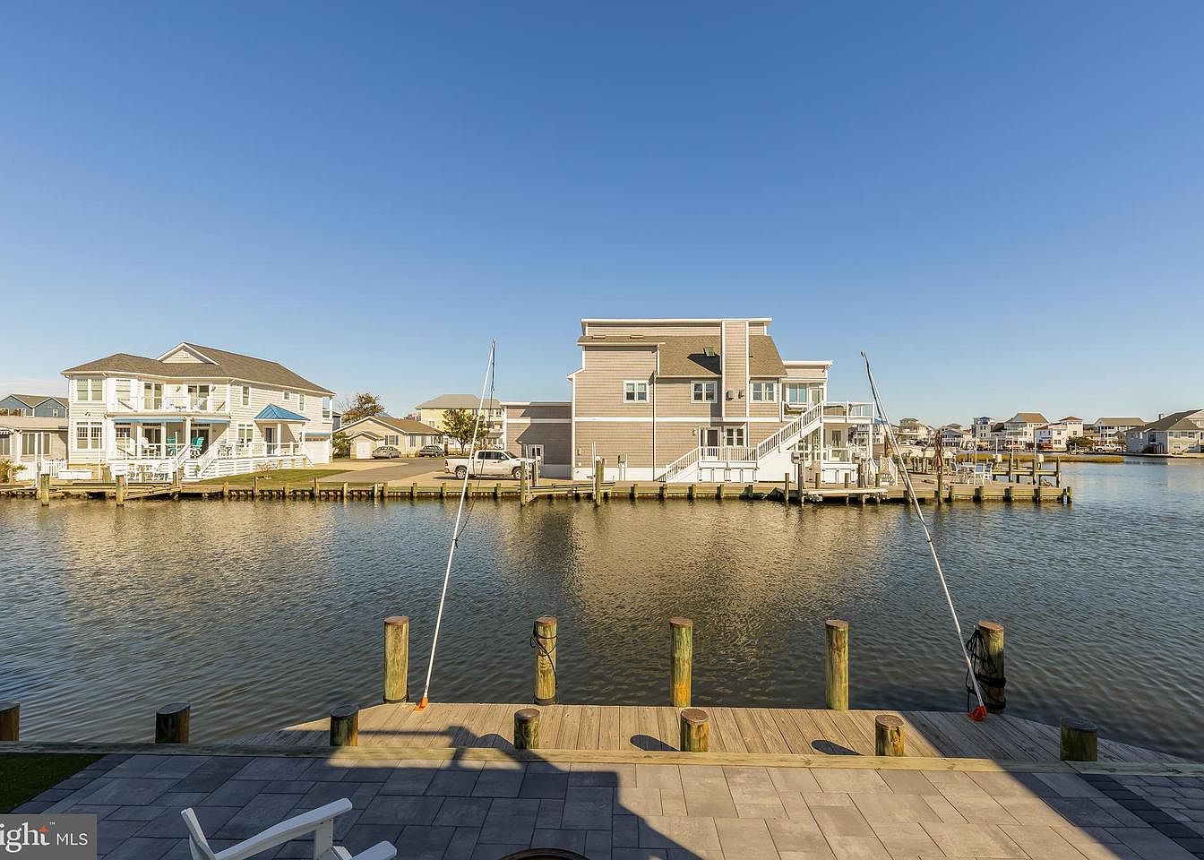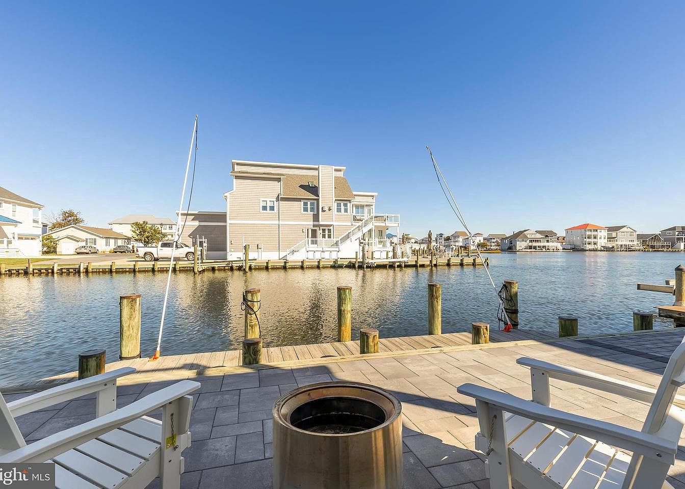 This outdoor patio provides a stunning view of a serene waterway lined with docks. White Adirondack chairs sit invitingly beside a round fire pit, ideal for gathering and relaxation. The patio features modern stone pavers that create a stylish space beneath the feet, complementing the natural surroundings. The home in the background showcases a contemporary design with a light wood façade and multiple windows reflecting the sunlight. Adjacent properties reveal a mix of similar waterfront homes, enhancing the coastal atmosphere. The bright blue sky adds to the tranquil setting, filtering light beautifully across the space.