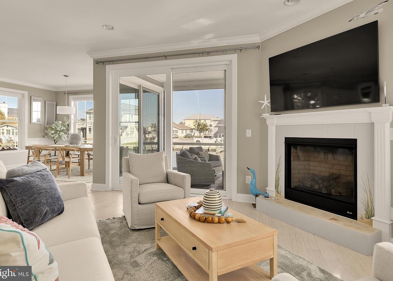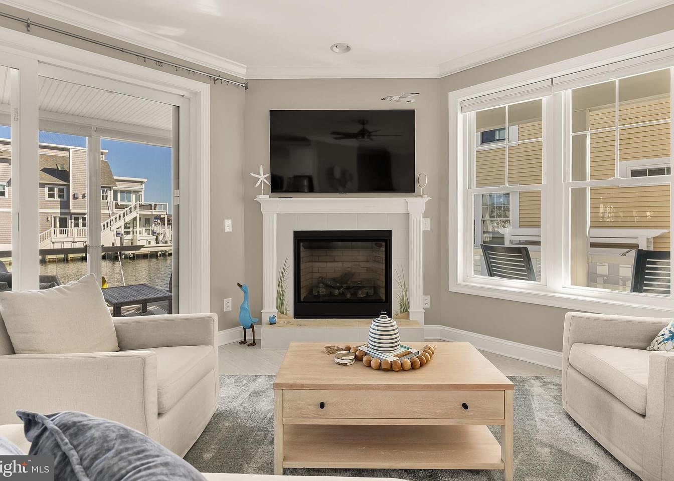This inviting living room features a soft, neutral color palette with light gray walls and pale wooden flooring. Plush white sofas face a stylish coffee table, adorned with decorative items like wooden beads and a striped vase. A sleek television is mounted above a bright white fireplace, which showcases natural stone accents. Large windows fill the space with natural light, providing views of the outdoor scenery. Cozy armchairs are positioned near the glass doors, enhancing the openness of the room. Elegant decor elements, such as starfish and a whimsical blue bird figure, add character and a coastal vibe.