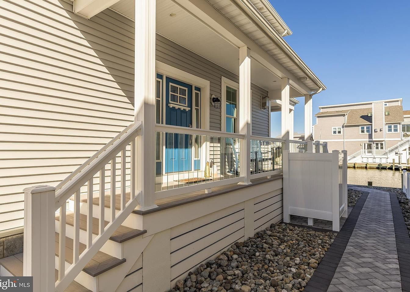This porch area features a cozy and inviting layout, highlighted by a striking blue front door that adds a pop of color against the soft beige siding. The well-maintained railing and staircase, accented with natural wood tones, enhance accessibility. Pebbled areas flank the walkway, which has a stylish herringbone pattern. The architectural details, including wide, overhanging eaves and simple, clean lines, create a modern coastal aesthetic. Sunlight casts soft shadows, emphasizing the textures of the siding and the smooth finish of the railings, contributing to the serene atmosphere ideal for relaxation in a picturesque neighborhood.