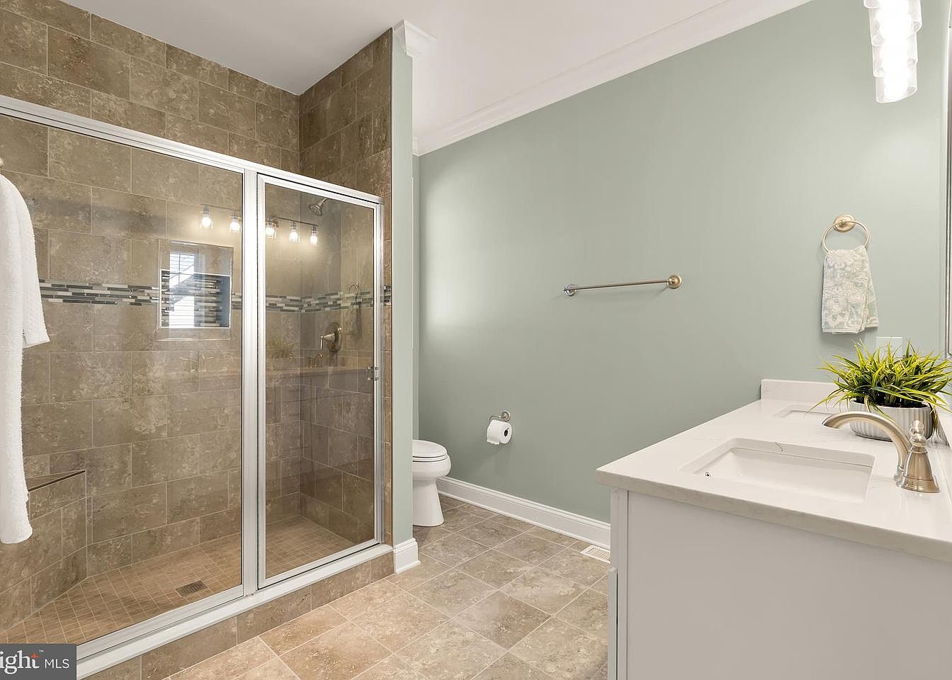 This modern bathroom features earthy tones with a calming green wall, creating a serene atmosphere. Elegant stone tiles cover the shower, complemented by a glass enclosure that offers a clear view of the rainfall showerhead and accent tile strip. The floor is adorned with large, neutral-colored tiles, enhancing the spacious feel. A sleek white vanity with a polished countertop houses a stylish sink and faucet, while a small green plant adds a touch of freshness. Lighting fixtures hang above the mirror, casting soft illumination, while a towel bar and decorative towel complete the functional yet aesthetic design.