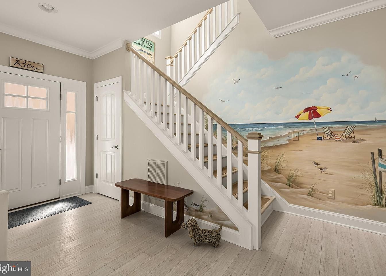 This entryway features a warm, inviting atmosphere with light-colored walls and natural wood accents. The space showcases a blend of functionality and aesthetic charm, highlighted by a wooden bench against the wall and a stylish rug near the entrance. A striking mural depicting a beach scene adorns the wall, complete with a vibrant yellow and red umbrella, beach chairs, and gentle waves, enhancing the coastal vibe. The open staircase, with sleek white railings, leads to the upper level, while large windows provide ample natural light, creating an airy and welcoming entry point for guests.