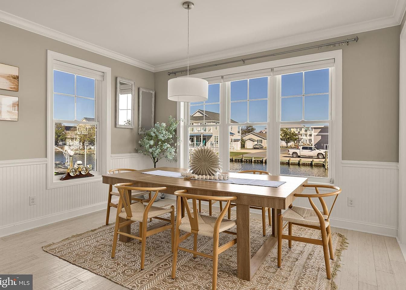 This dining room features a wooden table surrounded by elegantly designed chairs with a blend of comfort and style. Natural lighting pours in through large windows, offering a view of the serene outdoors. The walls are adorned with a soft beige hue, complemented by white wainscoting that adds a touch of sophistication. A modern pendant light hangs above the table, enhancing the space’s brightness. An intricate area rug anchors the furniture, while decorative elements like a sculptural centerpiece and greenery contribute to a warm, inviting atmosphere, perfect for family gatherings or intimate dinners.