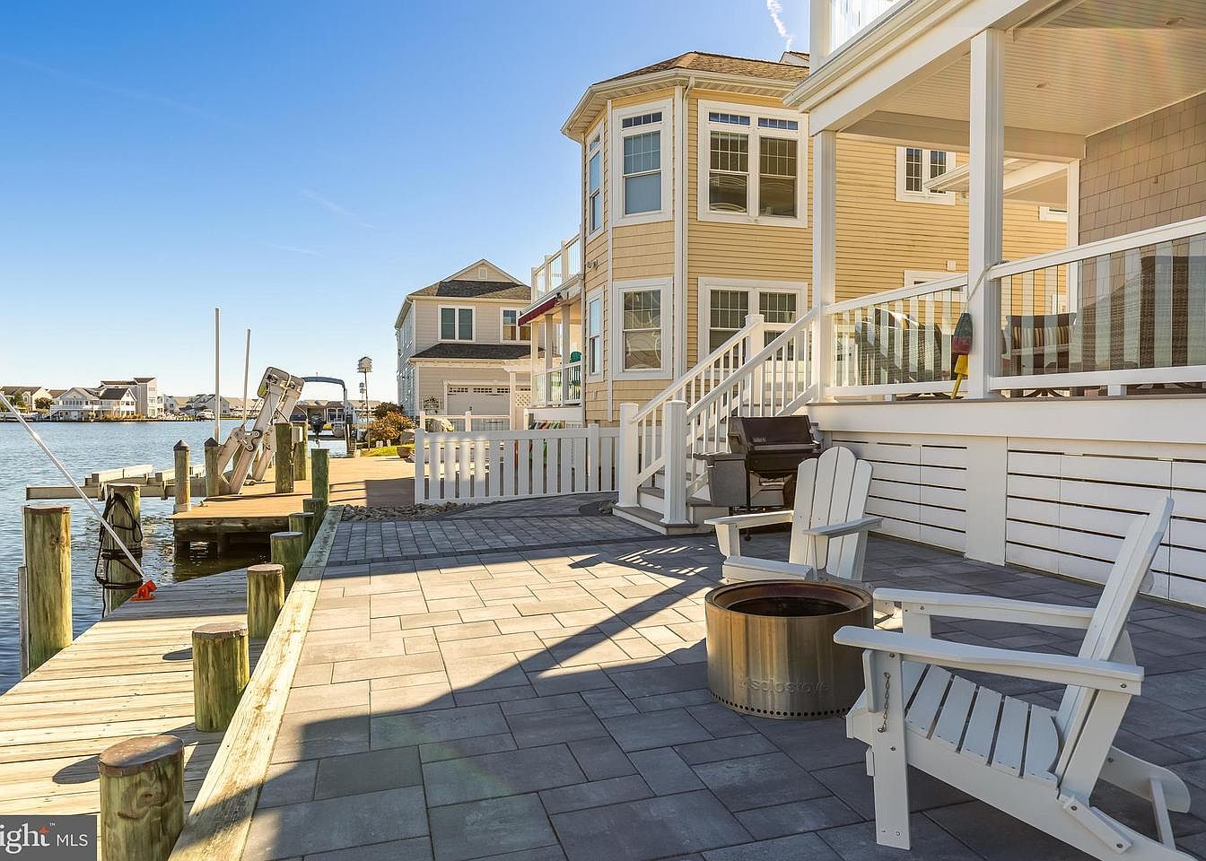 A spacious patio overlooks a tranquil waterway, featuring modern graystone pavers that create a stylish flooring element. Bright white Adirondack chairs invite relaxation, positioned around a sleek, circular fire pit that adds warmth to evenings outdoors. A grill rests nearby, perfect for outdoor cooking. The patio is framed by a charming white railing, leading gracefully to a staircase. The house showcases soft yellow siding and large windows that allow ample natural light while providing views of the surrounding water and neighboring homes. The overall design is inviting, blending comfort with a scenic waterfront lifestyle.