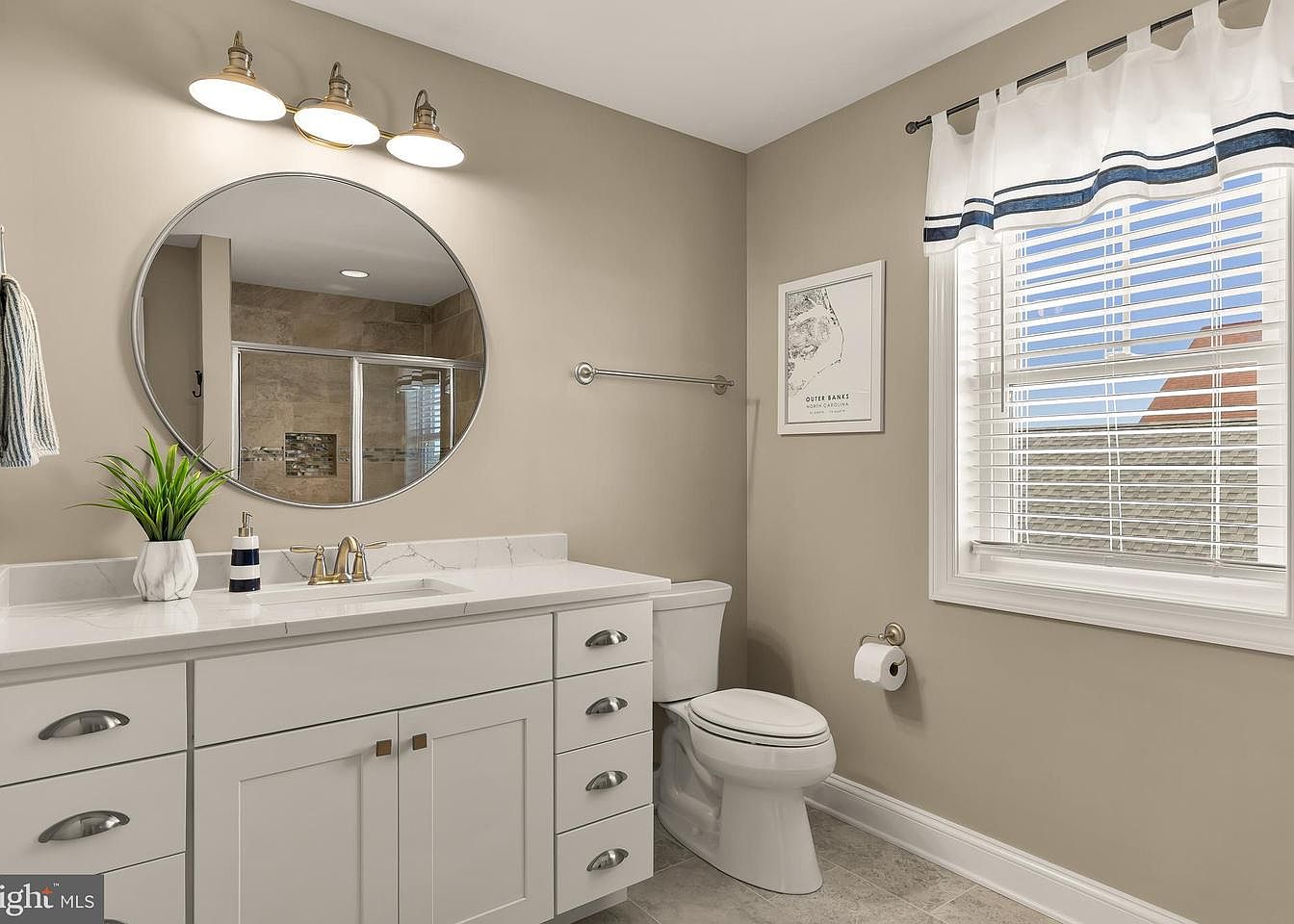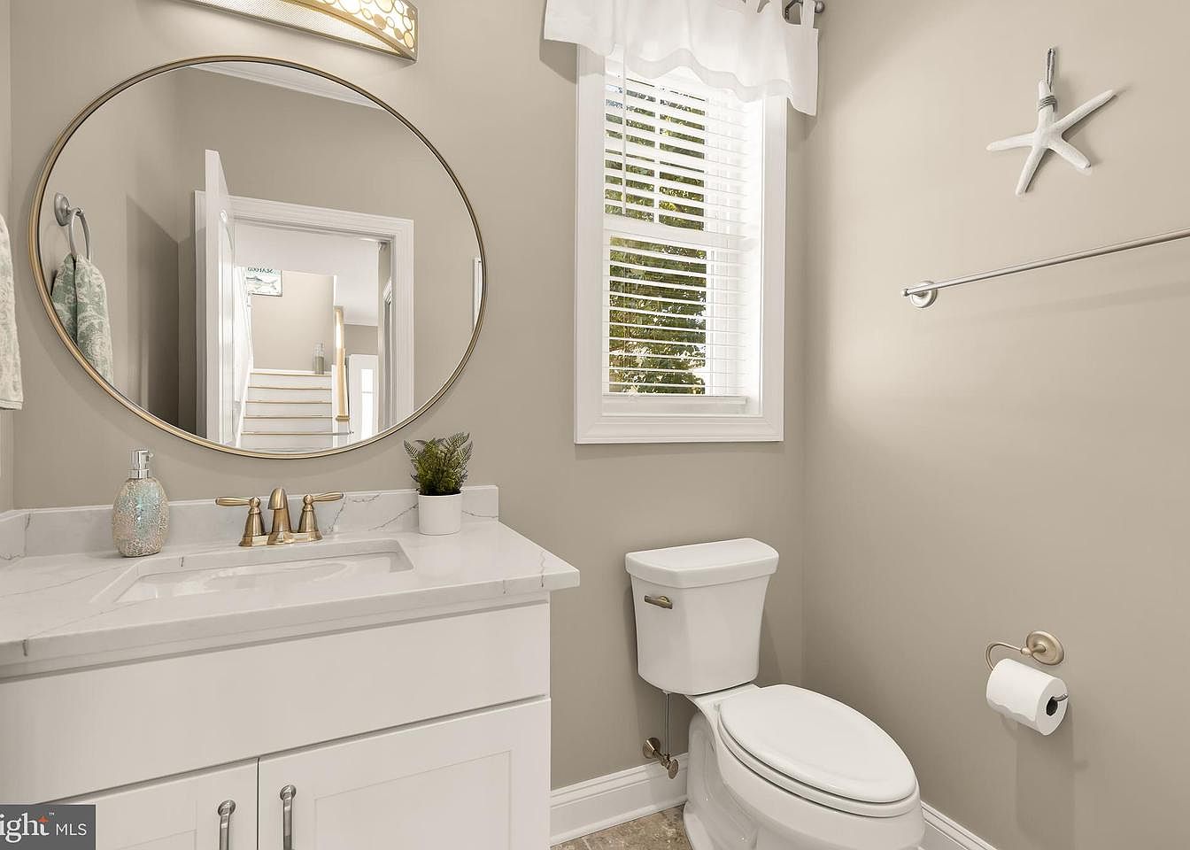 The bathroom features a sleek design with a light taupe color scheme that gives it a spacious feel. A contemporary oval mirror hangs above a white marble-topped vanity, complemented by stylish gold fixtures. The cabinetry is pristine white, enhancing the modern aesthetic. A small potted plant adds a touch of greenery. Natural light streams through a partially hidden window with white blinds, brightening the space. On the opposite wall, a clean toilet is positioned discreetly, while a tasteful silver towel bar and a decorative starfish accentuate the coastal theme. Stone flooring adds texture and warm undertones.