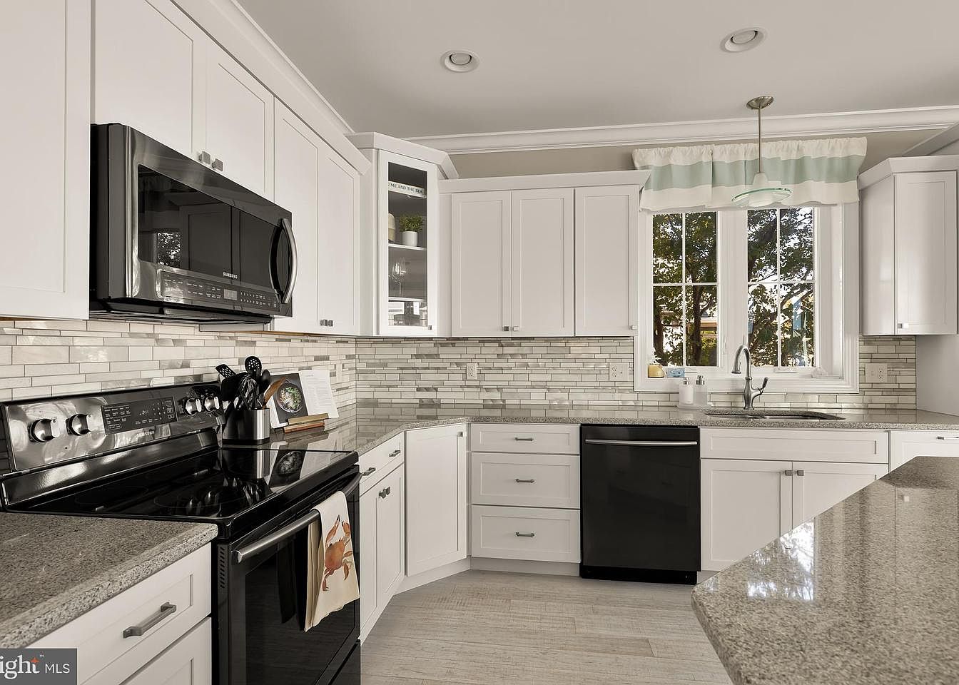 The kitchen features a modern and functional design with a U-shaped layout maximizing counter and storage space. Crisp white cabinetry contrasts elegantly with the dark black appliances, including a microwave and range. A light grey quartz countertop adds a touch of sophistication, complemented by a textured subway tile backsplash in soft neutral tones. Natural light floods in from a large window above the sink, framed by sheer curtains with mint green stripes. The space is thoughtfully organized, with utensils and dishware neatly displayed, enhancing the overall clean and inviting aesthetic.