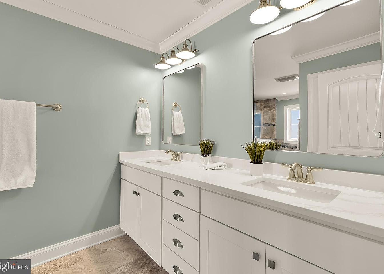 This spacious bathroom features a double vanity with crisp white cabinetry and a sleek, marble-like countertop. The soft mint-green walls create a calming atmosphere, complemented by two large rectangular mirrors that enhance the natural light. Modern, brushed gold fixtures, including faucets and lighting, add elegance, while white towels hang neatly on a polished towel rack. Each sink is adorned with small decorative plants, bringing a touch of nature indoors. The flooring consists of large, neutral tiles that contribute to a clean and contemporary feel, creating an inviting space for relaxation and daily routines.