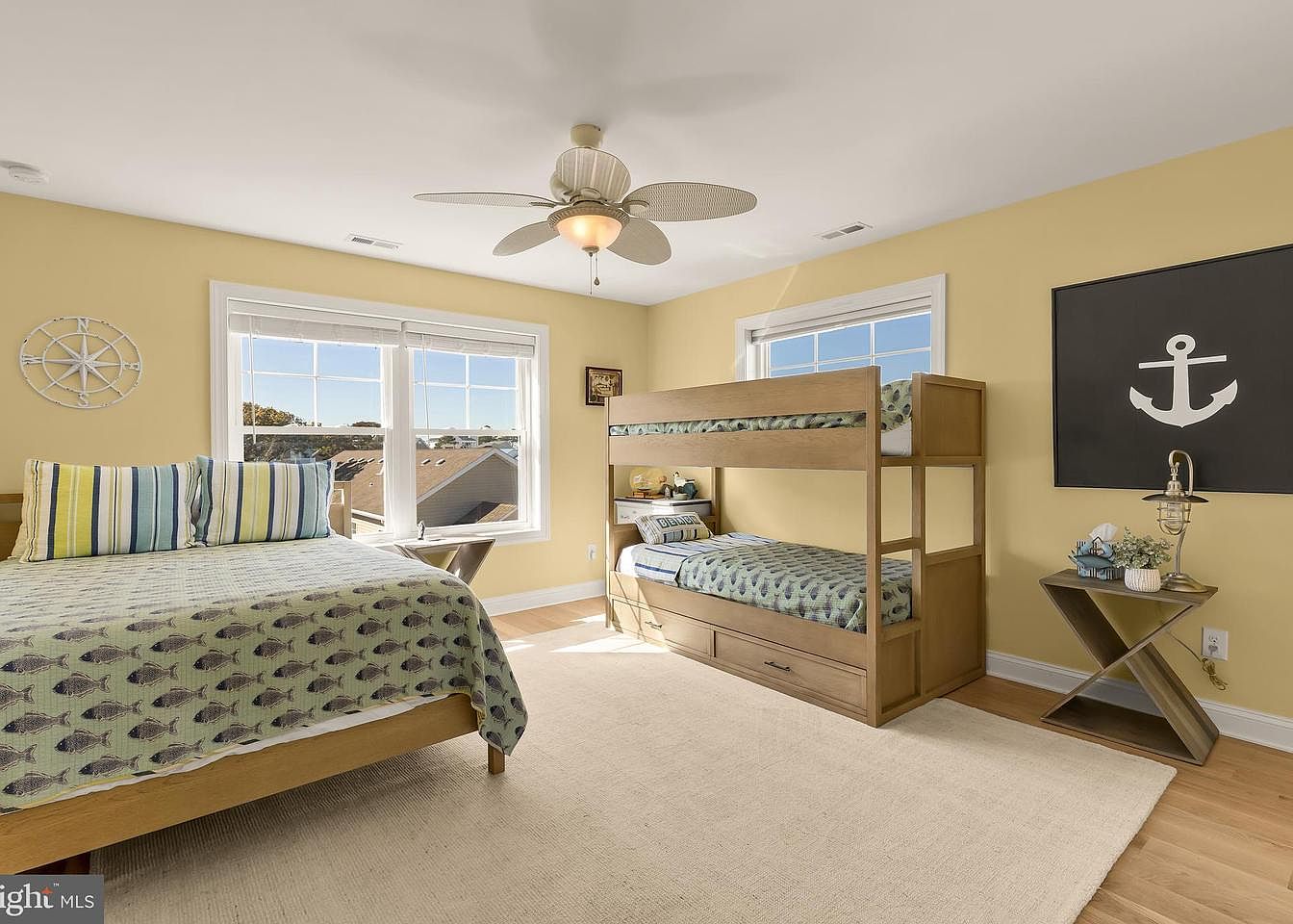 A cheerful kids’ bedroom features a warm yellow wall color, enhancing the light and airy feel. A bunk bed crafted from light wood occupies one corner, showcasing a fresh aquatic-themed bedding with fish patterns. Adjacent, a single bed has striped pillows, providing a playful contrast. Large windows invite abundant natural light, accentuating the soft beige rug underfoot. Decorative items, including a nautical-themed wall art and a compass-style wall decoration, add character. A modern side table holds a charming lamp and small decorative elements, complementing the space’s overall theme, making it both functional and inviting.