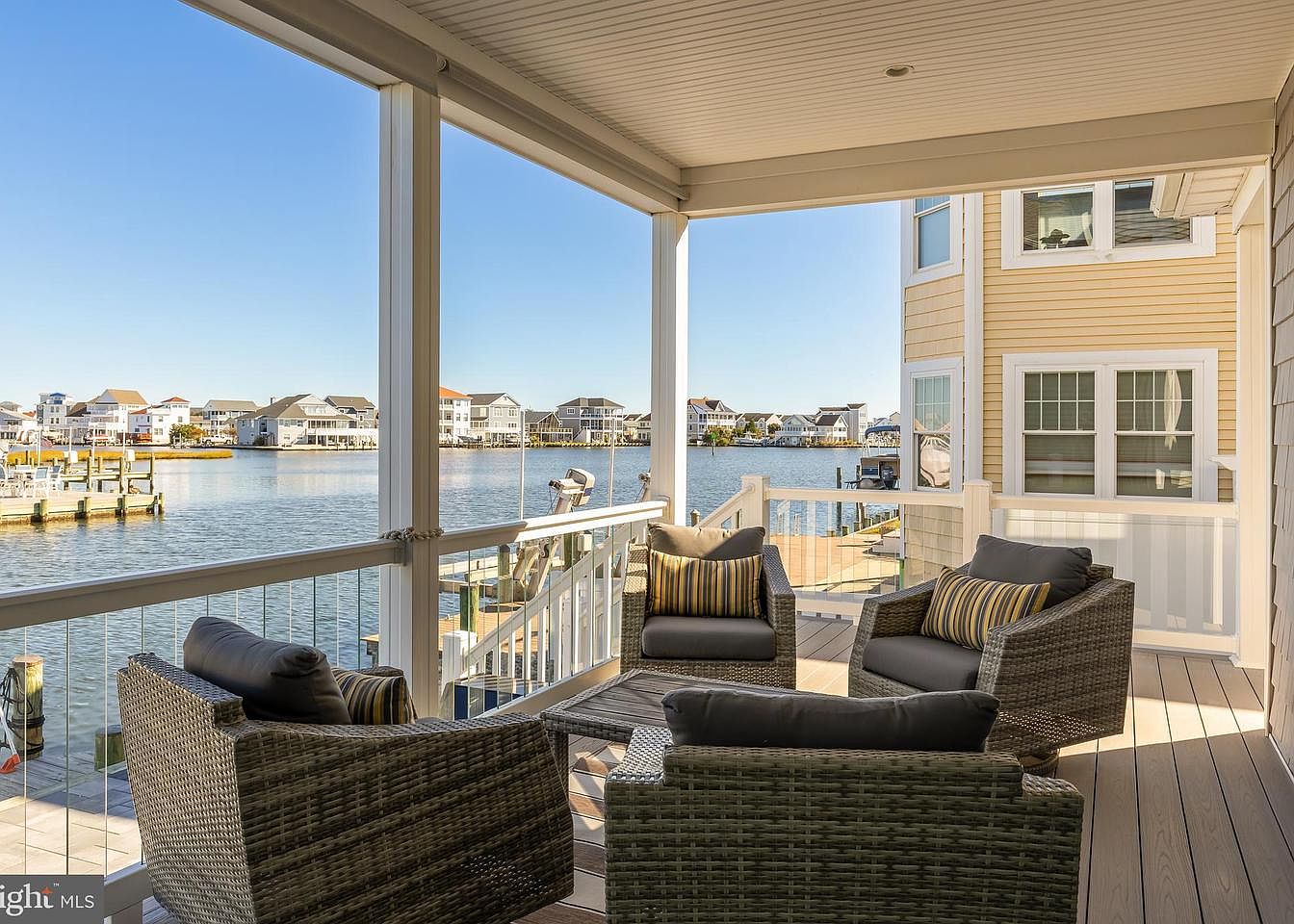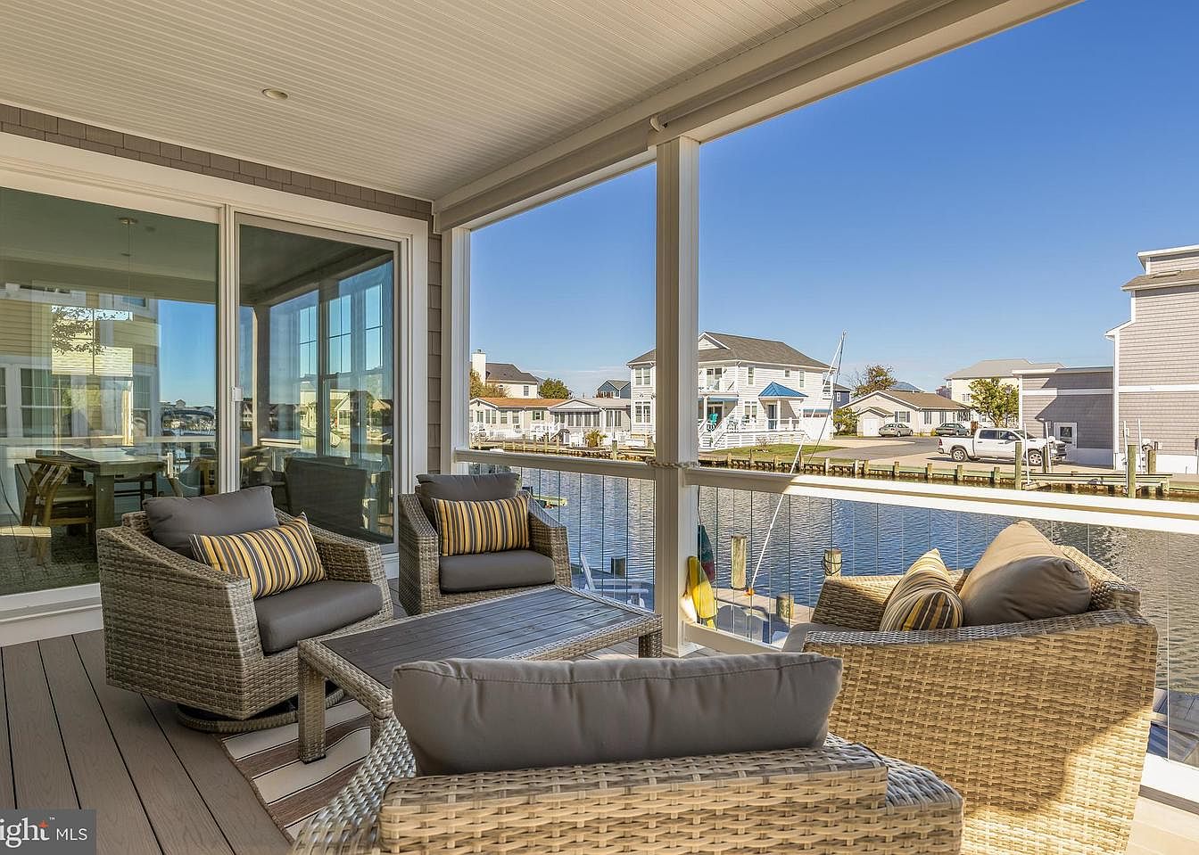 This screened porch offers a cozy outdoor living space that blends comfort with waterfront views. The area features a warm beige color palette, with light wooden flooring and a high ceiling that enhances the spacious feel. Four plush seating options, adorned with striped cushions, invite relaxation. Large screens facilitate an unobstructed flow of fresh air while keeping insects at bay. The openness to the shimmering water adds a tranquil ambiance, and the proximity to the adjacent dock emphasizes the connection to nature. Architectural details include white railings and large windows, seamlessly integrating the indoor with outdoor spaces.