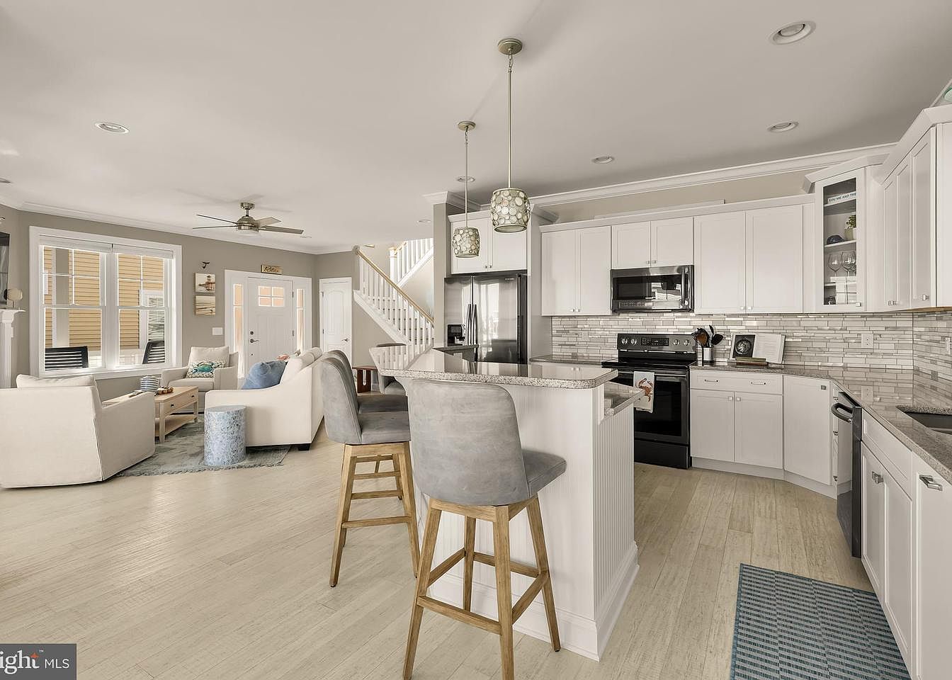 This kitchen area features a modern design with a light and airy atmosphere. The walls are painted in soft gray, complemented by white cabinetry that integrates seamlessly with the sleek black appliances. A large island with a granite countertop serves as the centerpiece, adorned with contemporary pendant lighting. Bar stools with wooden legs provide casual seating. The floor showcases light-colored wood, enhancing the spacious feel. Natural light floods the room through large windows, illuminating the inviting seating area with plush chairs. A patterned blue rug adds a subtle color pop, tying the aesthetic together.