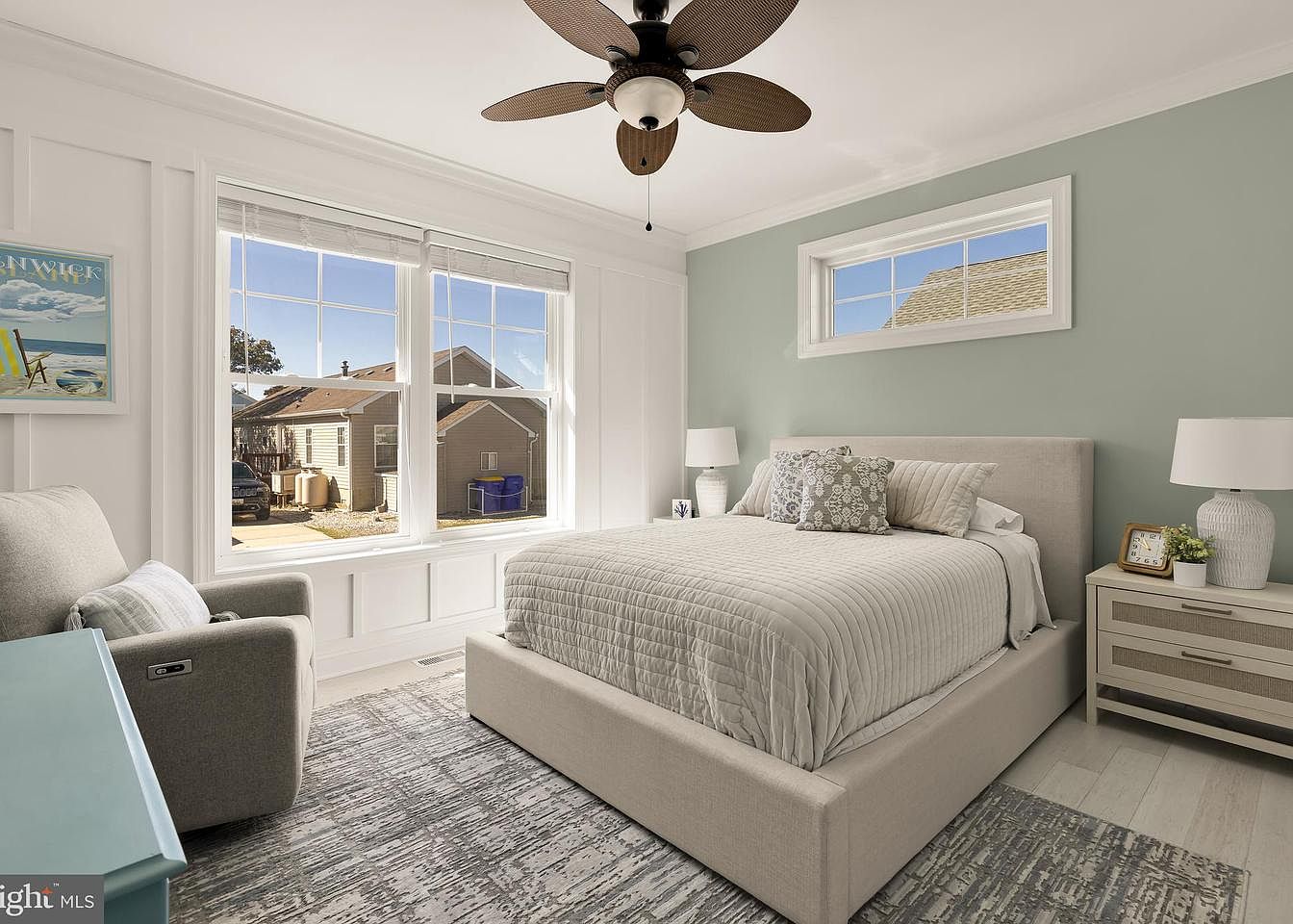 The bedroom features a soothing pale green accent wall contrasting with crisp white wainscoting, creating a serene atmosphere. A modern queen-sized bed with soft, layered bedding and decorative pillows is positioned centrally. Flanking the bed, two nightstands with textured surfaces hold stylish lamps, providing balanced lighting. A comfortable gray armchair sits nearby, inviting relaxation. Large windows let in ample natural light, offering views of the exterior while enhancing the room’s brightness. The hardwood floor is partially covered with a patterned area rug, adding warmth and texture. Functional yet elegant design elements enhance the room’s comfortable appeal.
