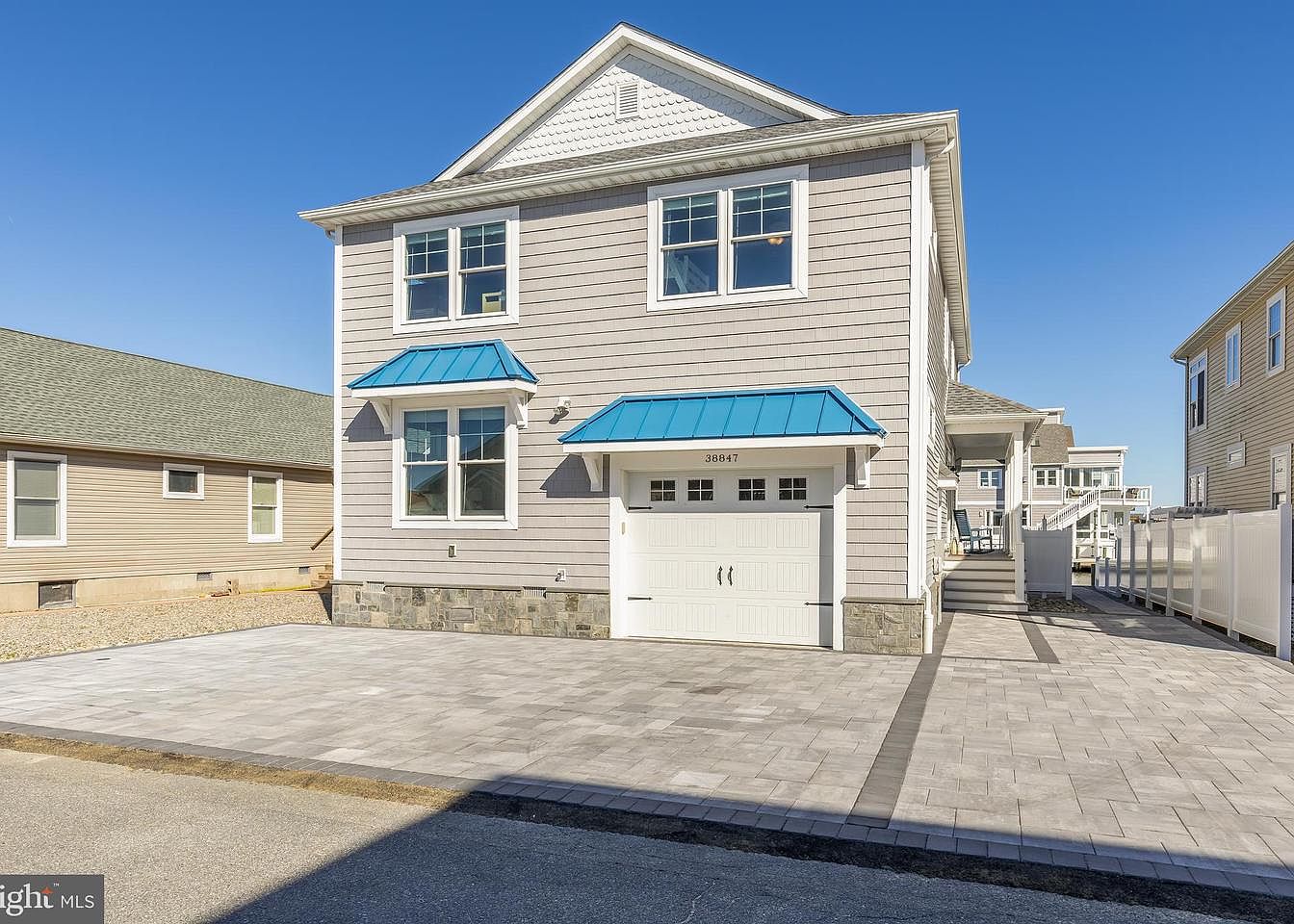 The image showcases a contemporary home featuring a light beige exterior clad in horizontal siding. The architectural style highlights a classic American design with modern accents. Two striking blue gable roofs adorn the front, capturing attention against the neutral palette. Large windows allow ample natural light, complemented by decorative stonework at the base. A spacious driveway made of gray pavers creates a welcoming entrance, connecting to a well-designed side pathway. On the right, partially concealed, a fenced area hints at privacy and outdoor space. The clear blue sky enhances the vibrant and inviting atmosphere of this home.