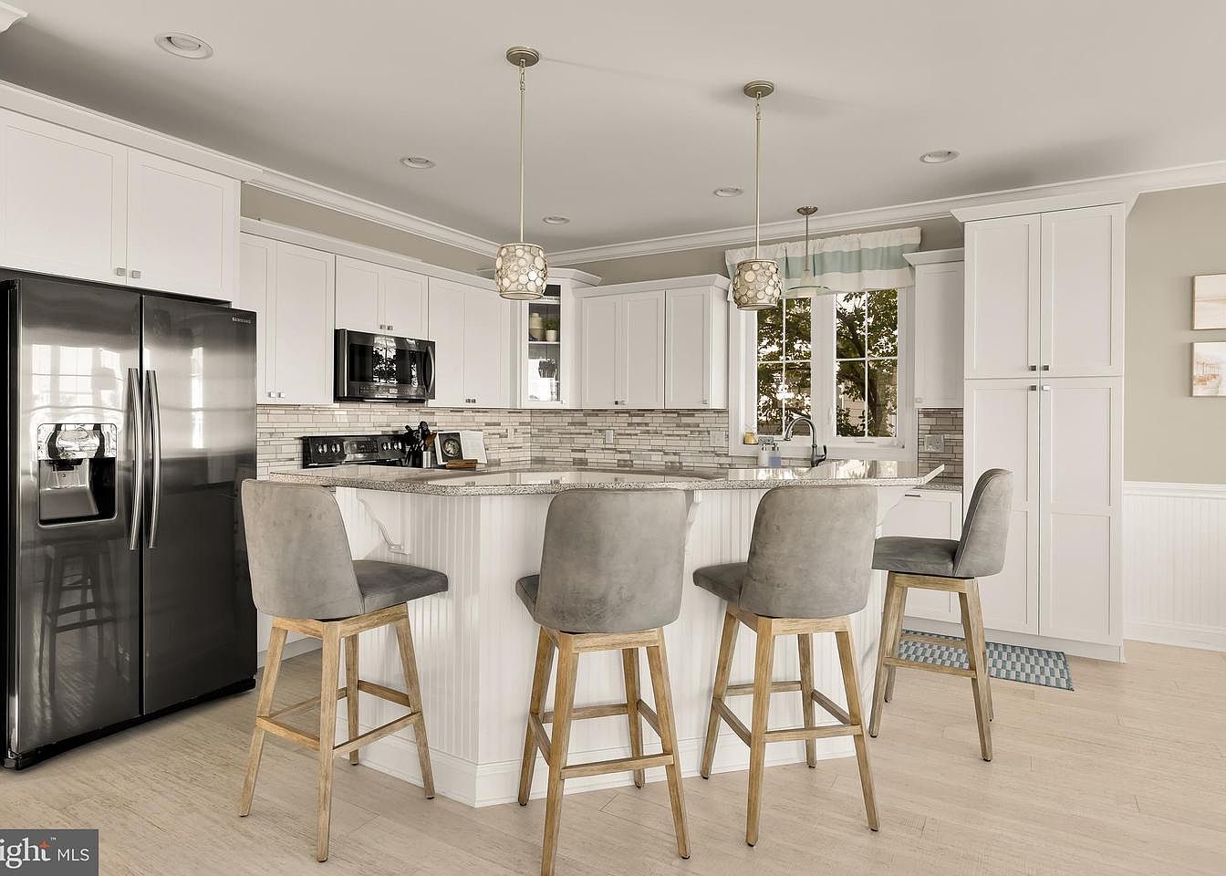 This modern kitchen features a central island with a smooth granite countertop, complemented by stylish pendant lighting. The cabinetry is predominantly white, enhancing brightness, with minimalist black hardware. A stainless steel fridge stands alongside a dark microwave and oven, providing a sleek contrast. Four upholstered bar stools, with soft gray fabric and light wooden legs, invite casual dining. The backsplash showcases a mix of light-colored tiles, adding texture. Large windows flood the space with natural light, showcasing greenery outside. The light wooden flooring creates warmth, tying together the modern yet cozy atmosphere of the kitchen.