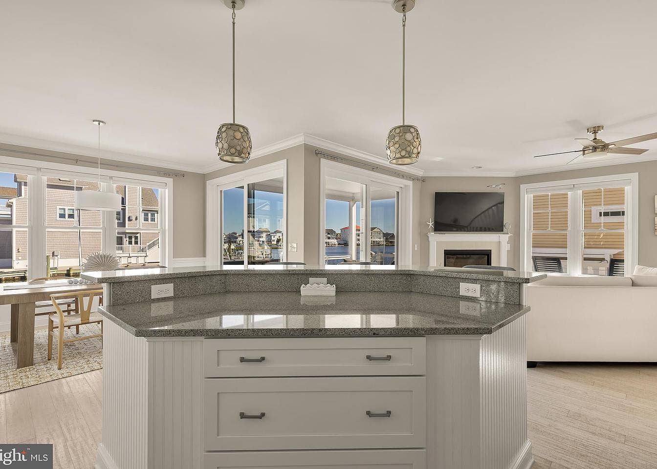 The kitchen features a modern, open layout with a spacious island at its center, adorned with a sleek granite countertop that reflects natural light. Surrounding the island are white cabinetry with simple, elegant hardware, enhancing the overall bright aesthetic. Overhead, stylish pendant lights add an artistic touch. The walls are painted in soft beige, complementing the warm, wooden dining table visible through large windows, which provide stunning views of the outside. Natural light floods the space, highlighting light-colored flooring and creating a welcoming atmosphere, ideal for both cooking and social gatherings.
