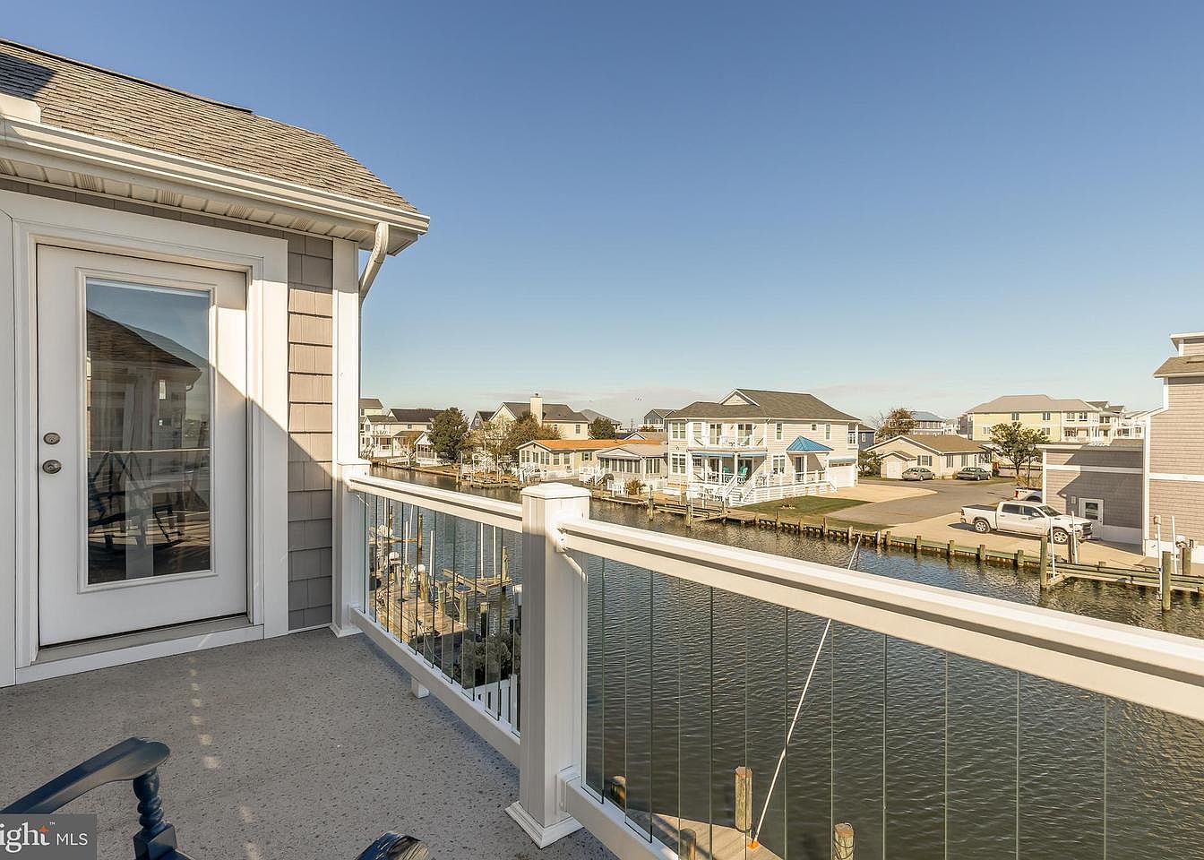 This outdoor balcony features a smooth, light gray surface that extends to a low railing, allowing unobstructed views of the serene waterway and neighboring homes. The railing incorporates clear glass panels, enhancing the sense of openness. A white door leads inside, contrasting with the faded gray siding of the house. On the left, a simple black chair invites relaxation, positioned to take advantage of the picturesque scene. Above, a clear blue sky complements the tranquil ambiance, while neighboring houses display a mix of coastal colors – blues, whites, and soft yellows, creating a cheerful neighborhood vibe.