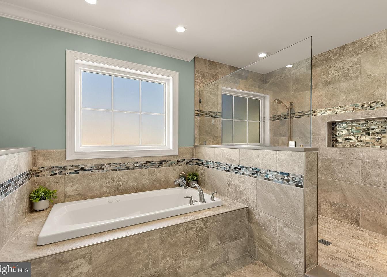 The bathroom features a luxurious design with a modern freestanding soaking tub positioned under a large window, allowing natural light to fill the space. The walls are painted a soft mint green, contrasting with the light beige stone tiles. A decorative mosaic tile strip in shades of blue and gray runs along the midsection of the wall, adding visual interest. The glass shower enclosure displays contemporary fixtures with a sleek handle. Recessed lighting illuminates the area, enhancing the elegant atmosphere. A small potted plant sits on the tub edge, introducing a touch of greenery for a serene ambiance.