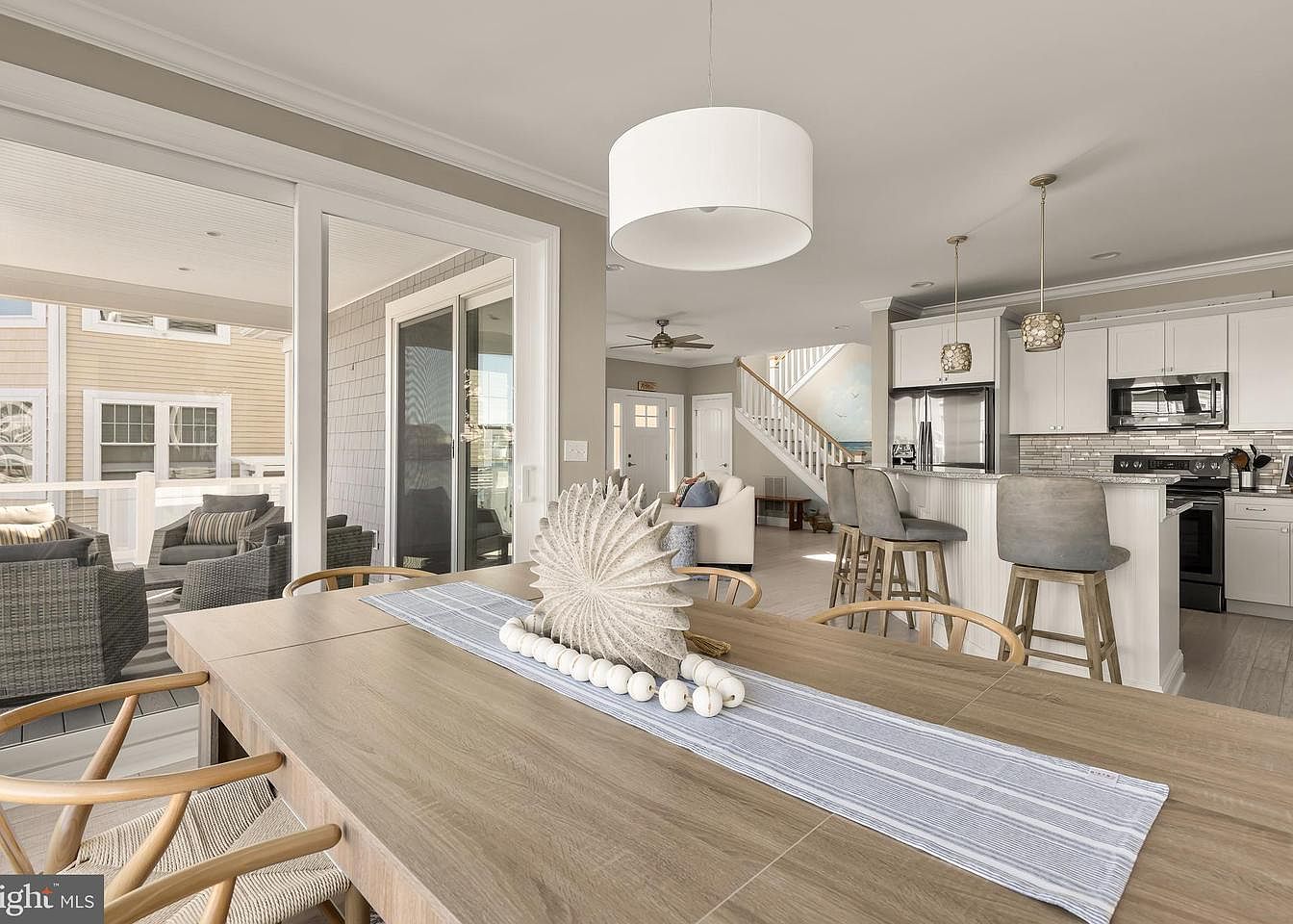 The dining area features a light wood table complemented by stylish, curved chairs with woven seats. A decorative centerpiece, resembling a sea shell, adds a coastal touch. Natural light floods the space through large windows, offering views of the outdoor seating area with gray wicker furniture and striped cushions. The soft color palette includes light neutral tones, enhancing the airy feel. A contemporary pendant light hangs above the table, while a slide door leads to the outdoor patio. Across the room, an open-concept design reveals a sleek kitchen with white cabinetry and modern appliances, creating a seamless flow.