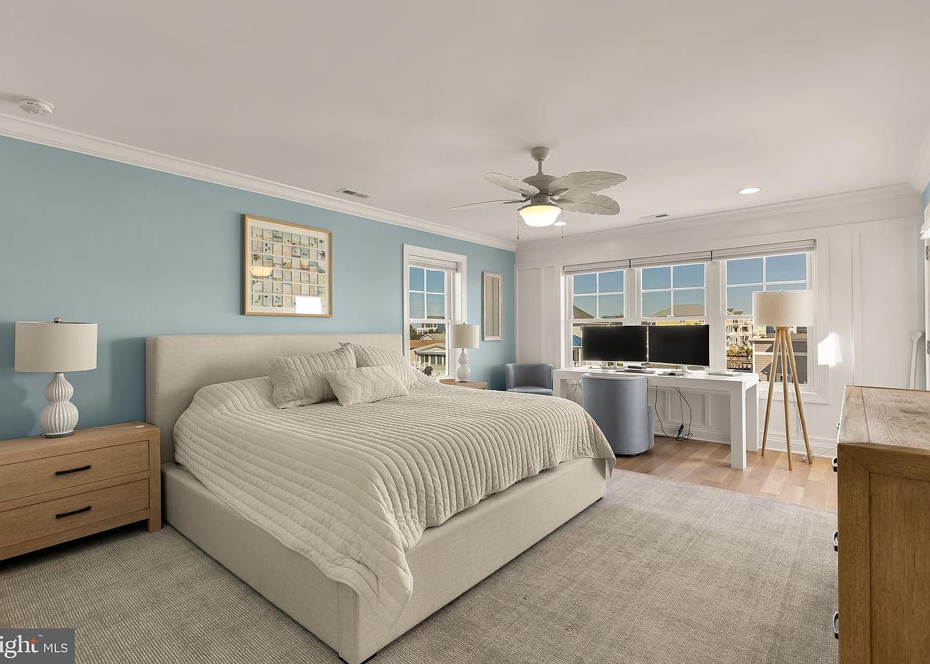 A serene bedroom showcasing a light coastal aesthetic. The color palette features soft blues and clean whites, creating a tranquil atmosphere. A plush cream quilt covers a large bed adorned with textured pillows, while a stylish ceiling fan with leaf-shaped blades enhances the airy feel. To one side, a flat-screen TV is mounted above a wooden dresser with sleek black handles, offering functional style. Opposite the bed, a dual workstation with two monitors enjoys natural light from large windows, framed beautifully, providing a peaceful view of the outdoors. A door leads to an outdoor area, further enhancing the space.