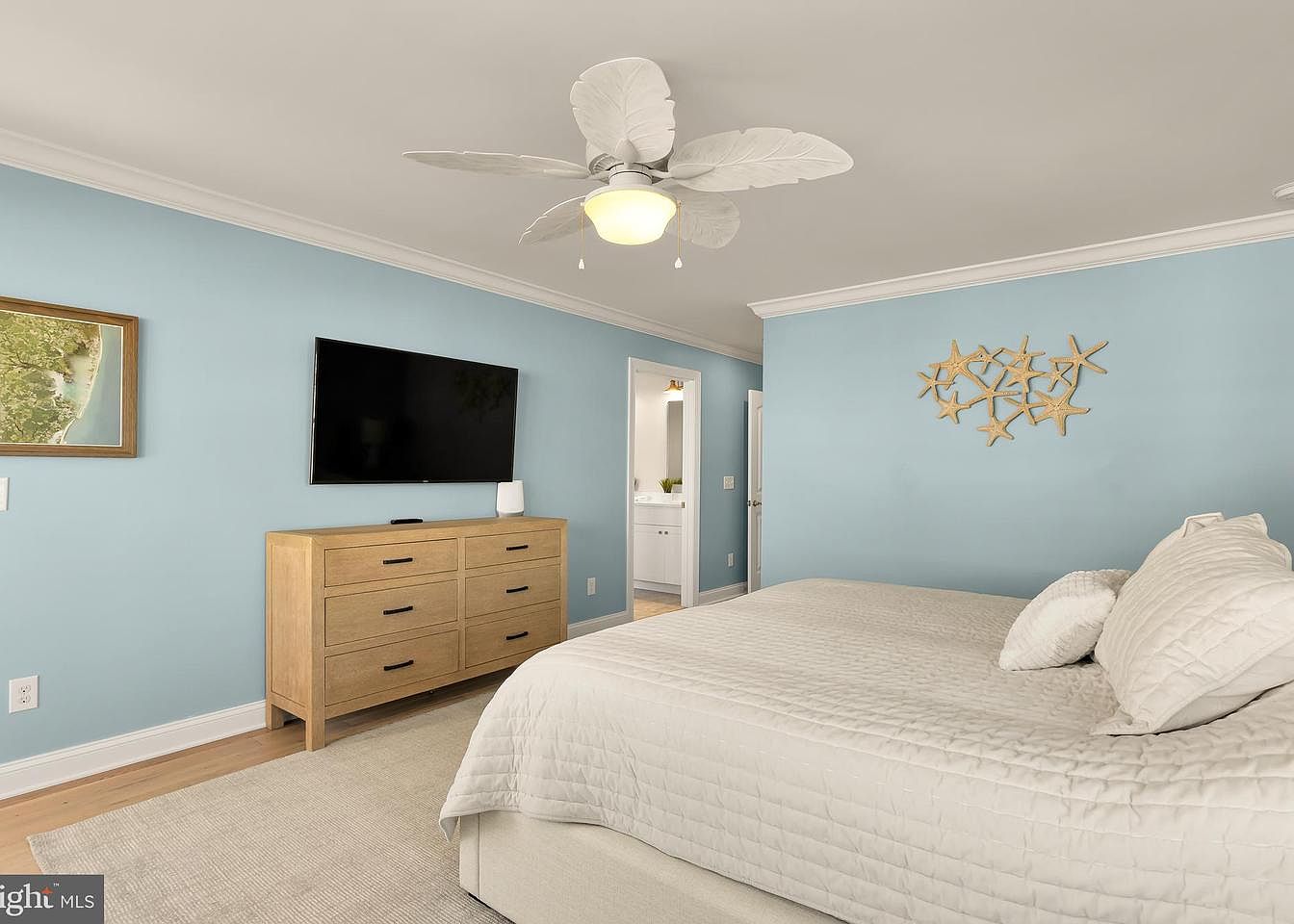 Spacious bedroom with a light, airy ambiance created by soothing aqua walls. A king-sized bed draped in soft white linens anchors the room, complemented by two plush pillows. Adjacent, a sleek wooden dresser with black handle accents offers ample storage. Above the dresser, a flat-screen TV provides modern convenience. A ceiling fan with leaf-shaped blades adds a tropical touch while ensuring comfort. Natural light streams in through a doorway leading to an adjoining space. Decorative starfish art on the wall adds a beachy vibe, enhancing the tranquil, coastal-inspired aesthetic of this inviting retreat.