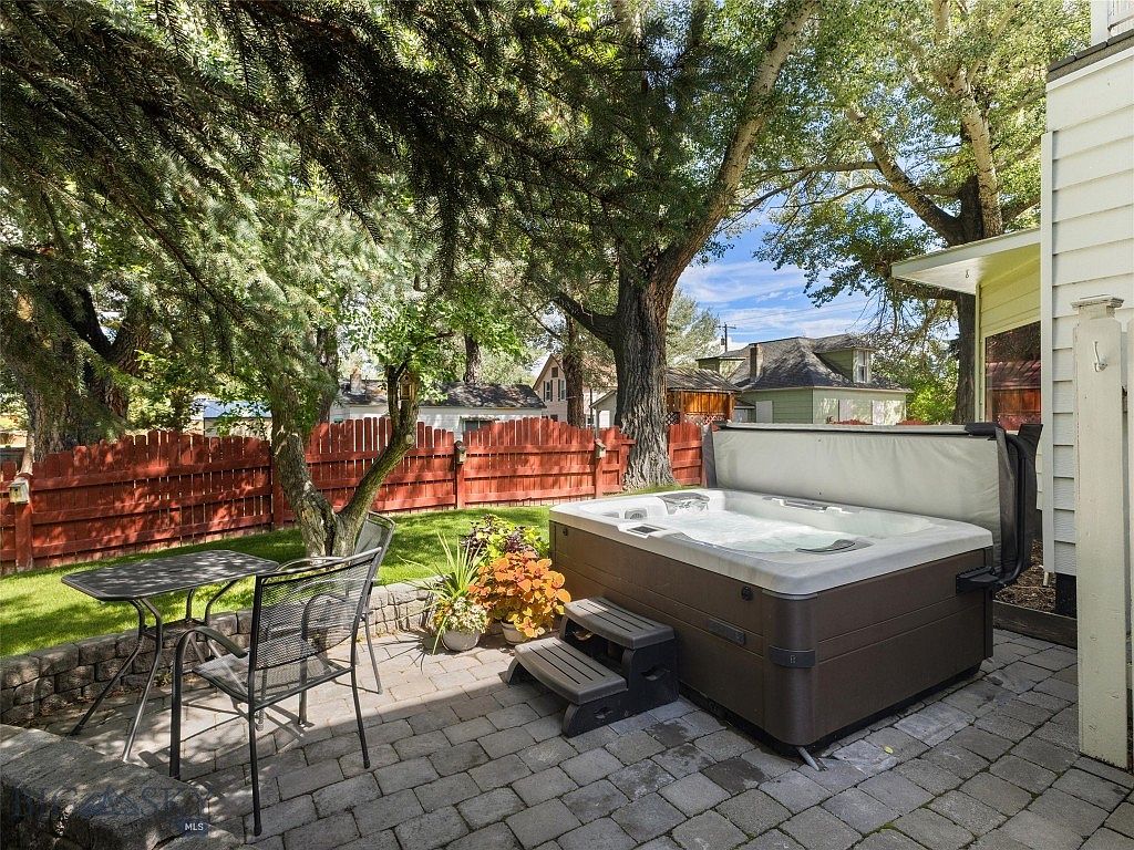 A relaxing outdoor space featuring a hot tub placed on a stone paver patio, surrounded by a verdant garden. Lush trees provide ample shade while varied greenery enhances the tranquil setting. Adjacent to the hot tub is a simple black metal patio set, comprised of a round table and four chairs, inviting leisurely meals. A bright array of flowers, including yellows and reds, adds vibrant splashes of color amidst the greenery. The wooden fence in a rich red tone complements the natural elements, creating a cozy, private atmosphere perfect for unwinding. The sky above is clear, suggesting a beautiful day.